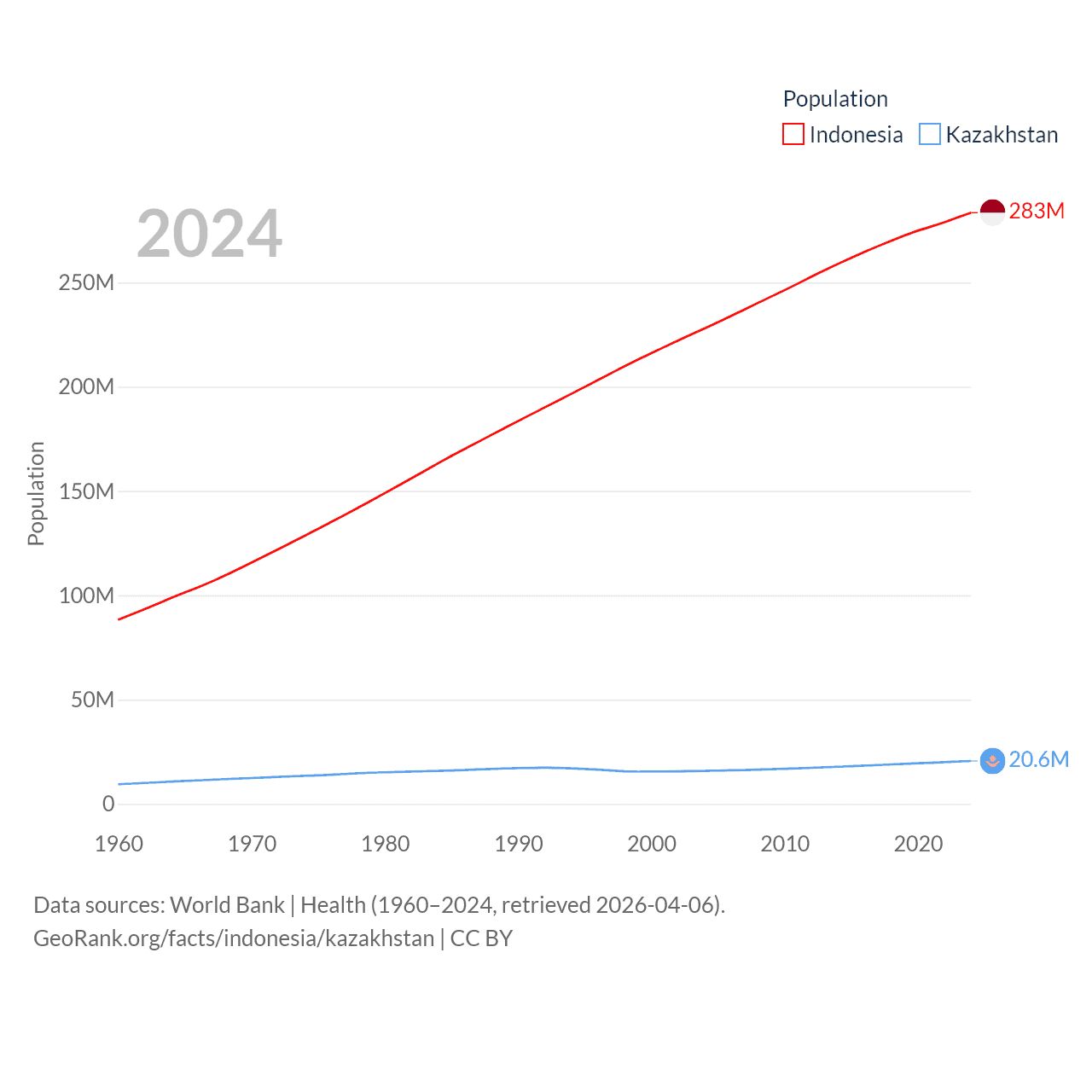 Indonesia has a population of 283M (ranked 4/197), compared with 20.6M in Kazakhstan (ranked 64/197). Indonesia's land area is 730,720 sq mi versus 1,042,360 sq mi for Kazakhstan (ranked 14th vs. 9th).