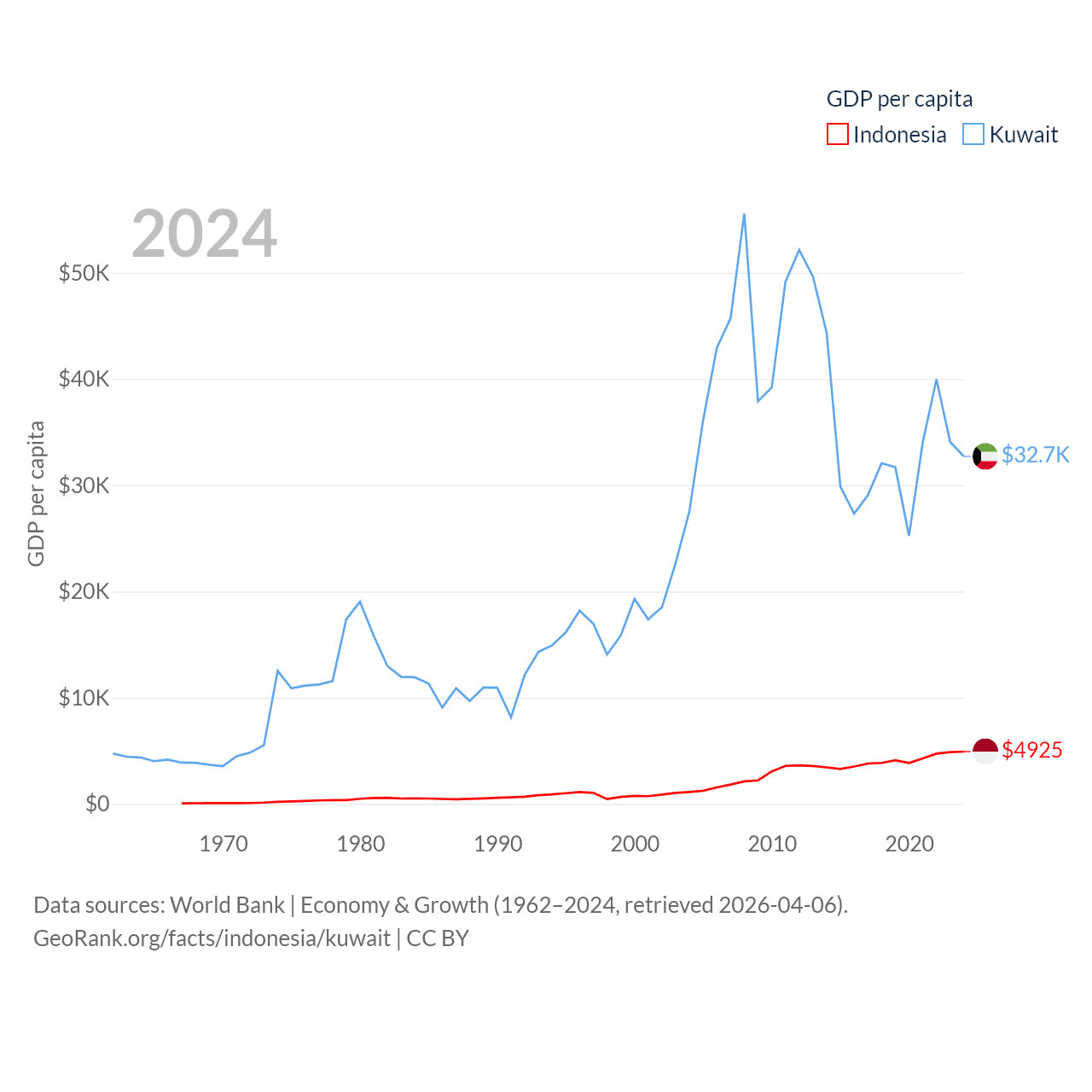 By GDP, Indonesia ranks 16/197 ($1.4T) and Kuwait ranks 59/197 ($160B). By GDP per capita, Indonesia ranks 121/197 ($4,925), while Kuwait ranks 37/197 ($32,718).