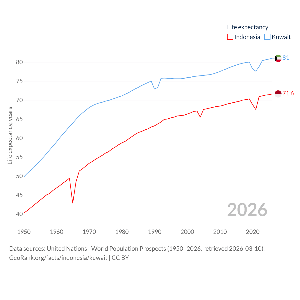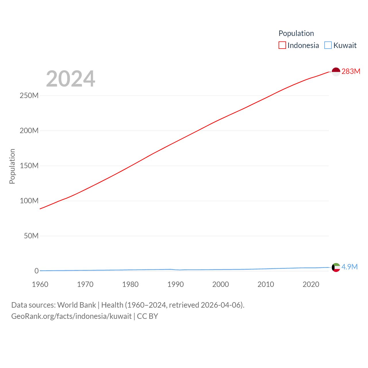 Indonesia has a population of 283M (ranked 4/197), compared with 4.9M in Kuwait (ranked 127/197). Indonesia's land area is 730,720 sq mi versus 6,880 sq mi for Kuwait (ranked 14th vs. 153rd).