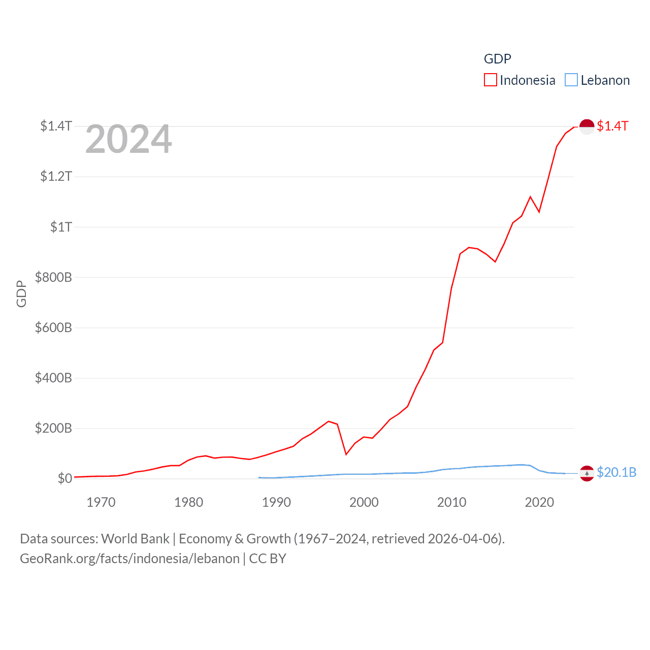 By GDP, Indonesia ranks 16/197 ($1.4T) and Lebanon ranks 128/197 ($20.1B). By GDP per capita, Indonesia ranks 121/197 ($4,925), while Lebanon ranks 135/197 ($3,478).
