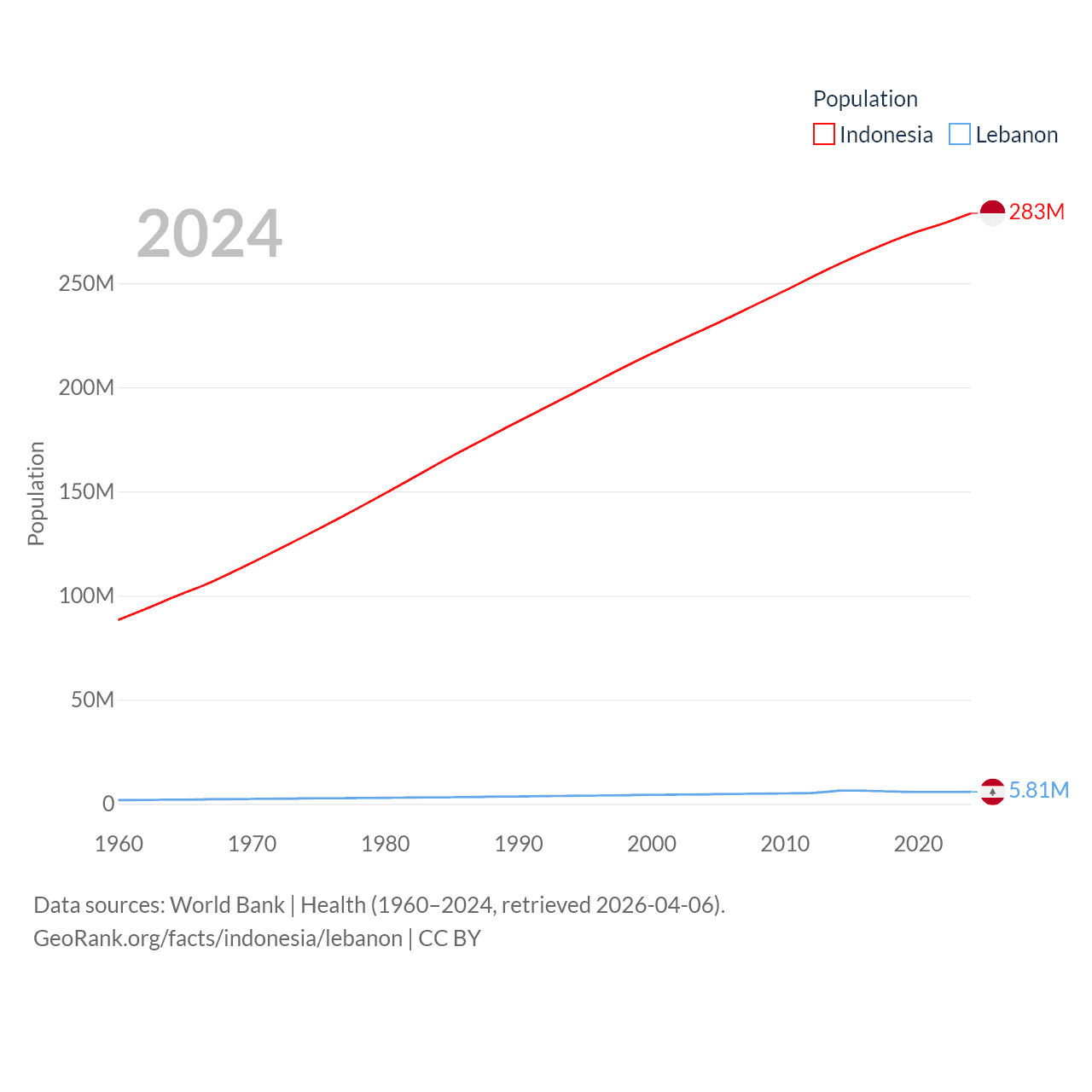 Indonesia has a population of 283M (ranked 4/197), compared with 5.81M in Lebanon (ranked 115/197). Indonesia's land area is 730,720 sq mi versus 3,950 sq mi for Lebanon (ranked 14th vs. 160th).