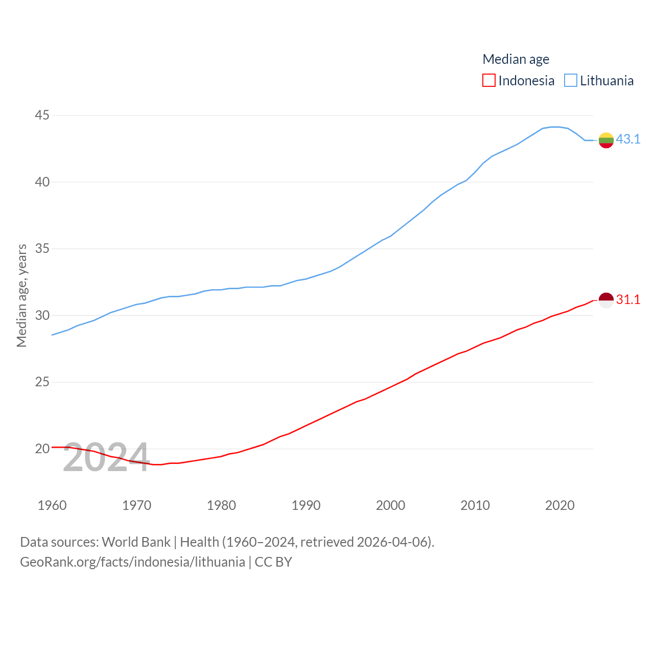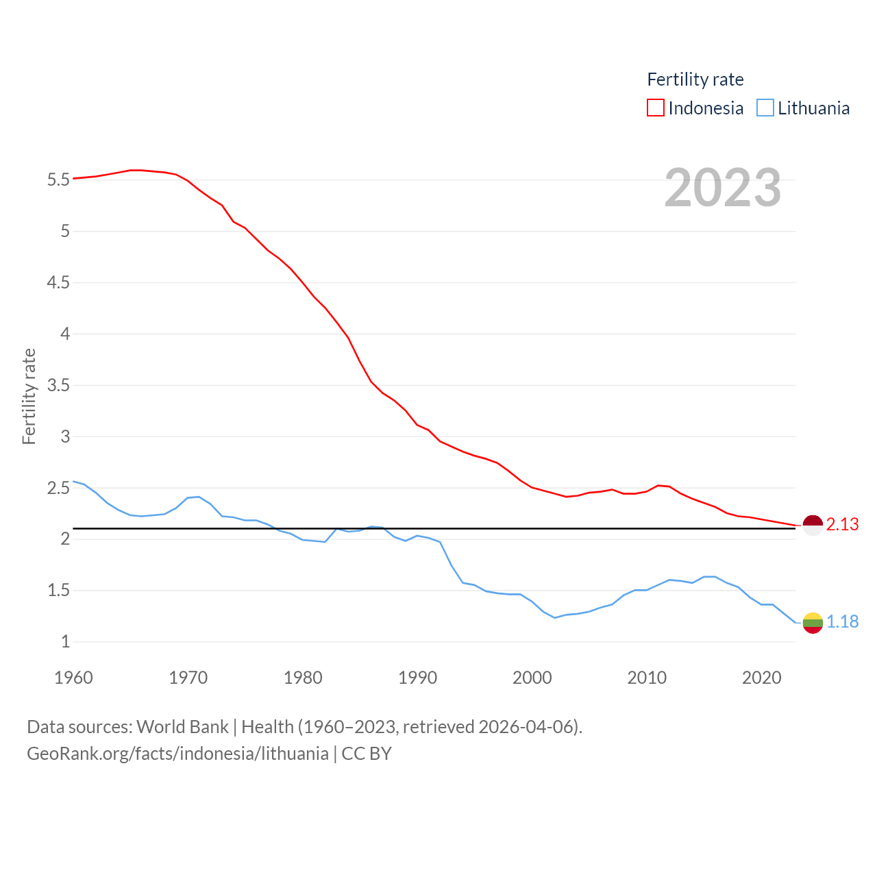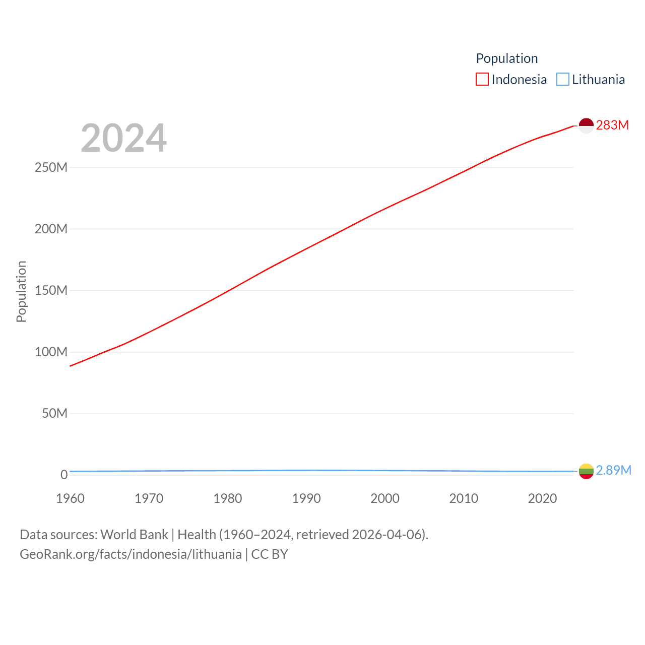 Indonesia has a population of 283M (ranked 4/197), compared with 2.89M in Lithuania (ranked 137/197). Indonesia's land area is 730,720 sq mi versus 24,170 sq mi for Lithuania (ranked 14th vs. 120th).