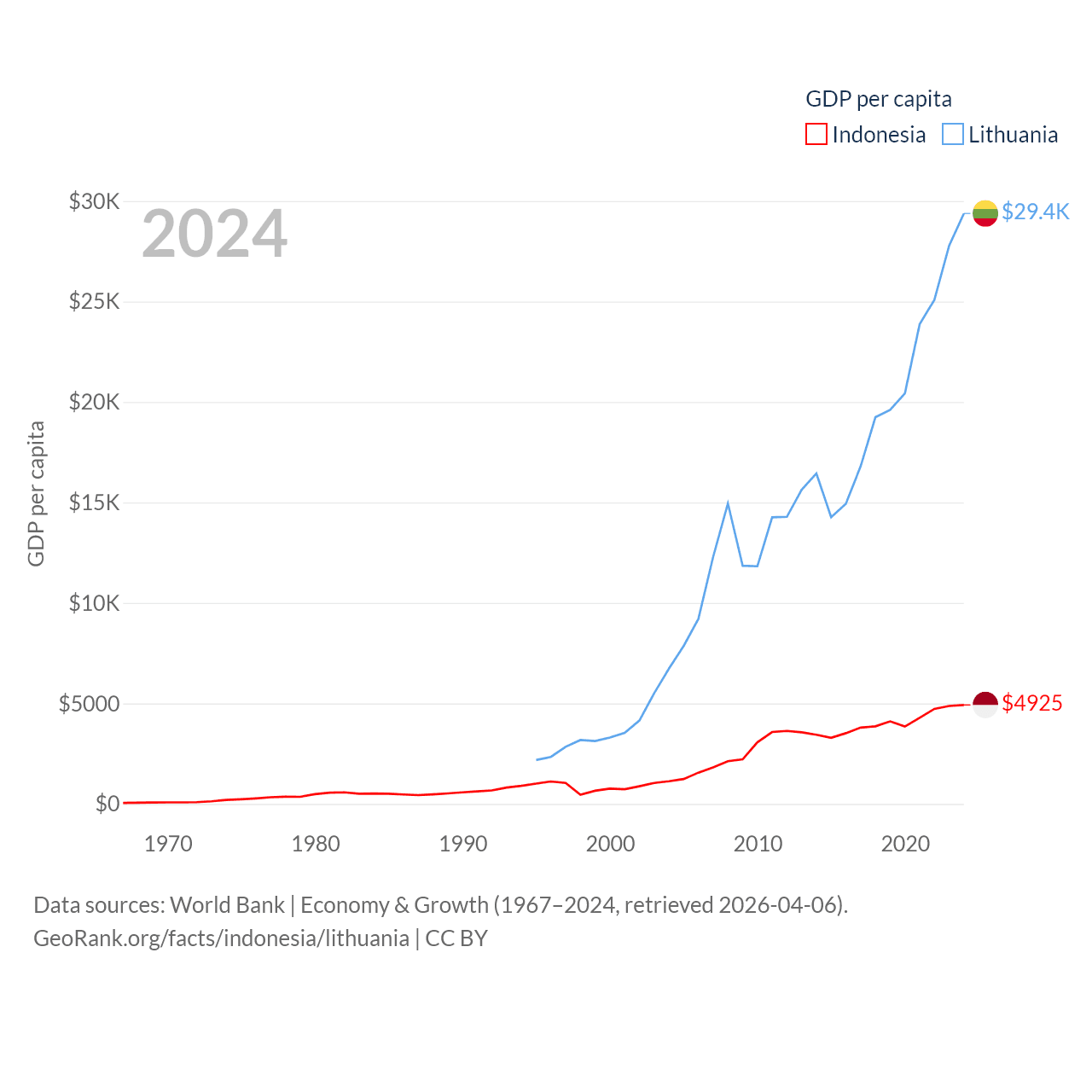 By GDP, Indonesia ranks 16/197 ($1.4T) and Lithuania ranks 79/197 ($84.9B). By GDP per capita, Indonesia ranks 121/197 ($4,925), while Lithuania ranks 43/197 ($29,384).