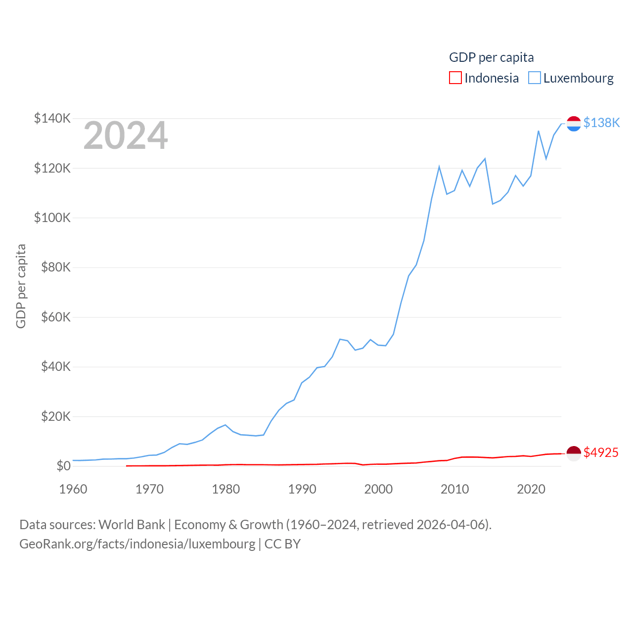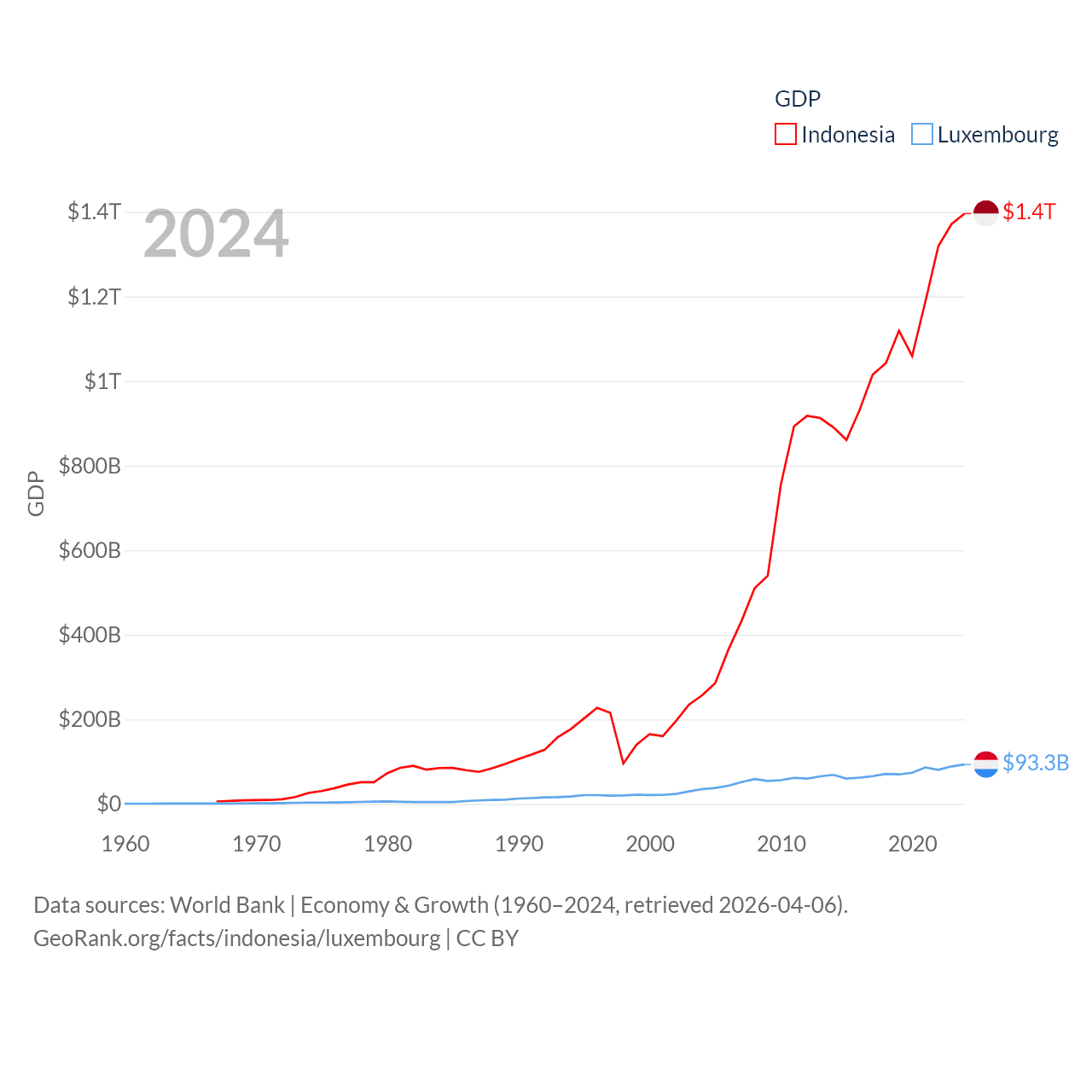 By GDP, Indonesia ranks 16/197 ($1.4T) and Luxembourg ranks 74/197 ($93.3B). By GDP per capita, Indonesia ranks 121/197 ($4,925), while Luxembourg ranks 3/197 ($137,782).