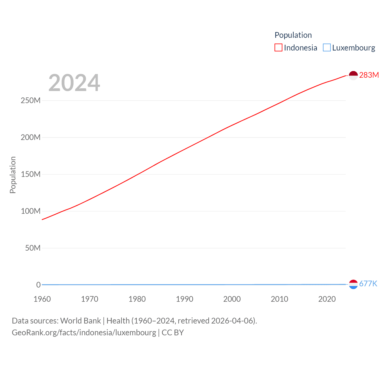 Indonesia has a population of 283M (ranked 4/197), compared with 677K in Luxembourg (ranked 164/197). Indonesia's land area is 730,720 sq mi versus 994 sq mi for Luxembourg (ranked 14th vs. 169th).
