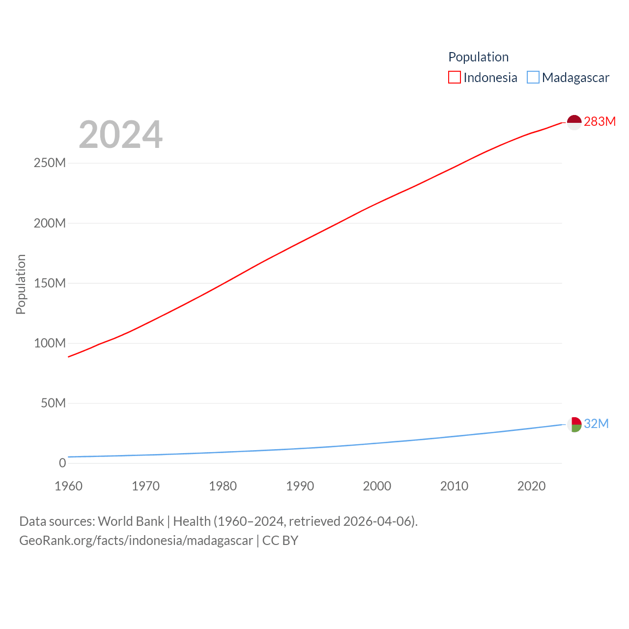 Indonesia has a population of 283M (ranked 4/197), compared with 32M in Madagascar (ranked 49/197). Indonesia's land area is 730,720 sq mi versus 224,634 sq mi for Madagascar (ranked 14th vs. 44th).