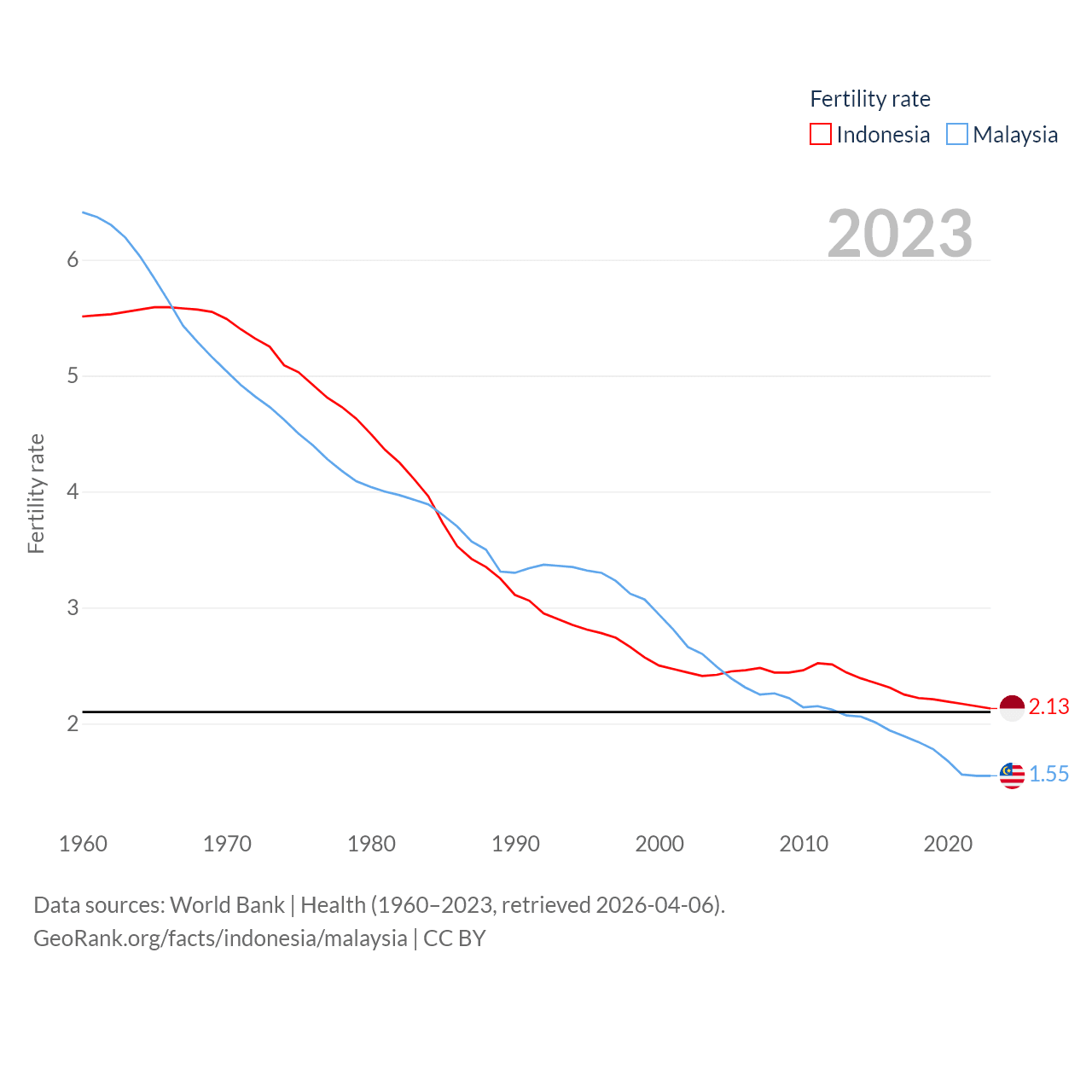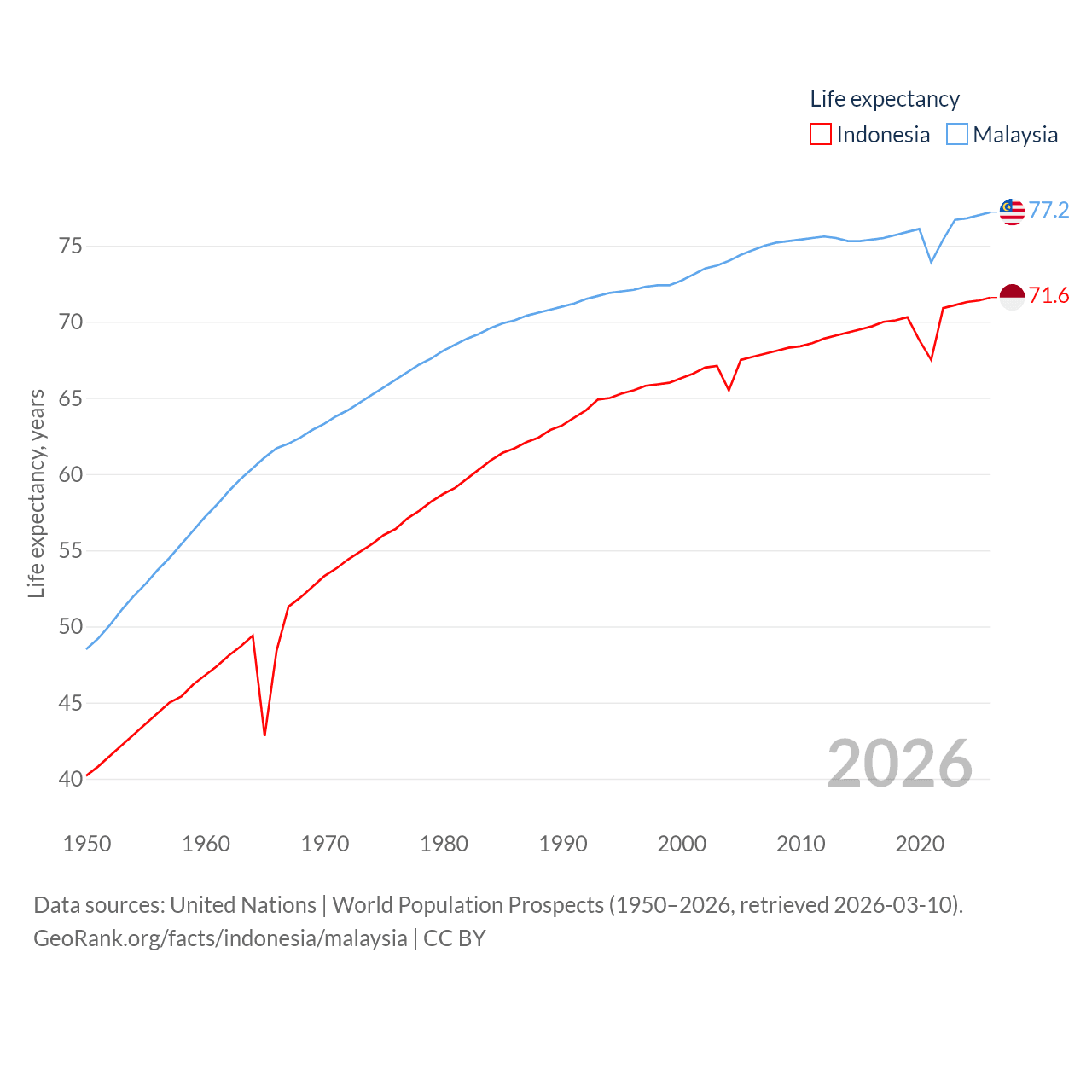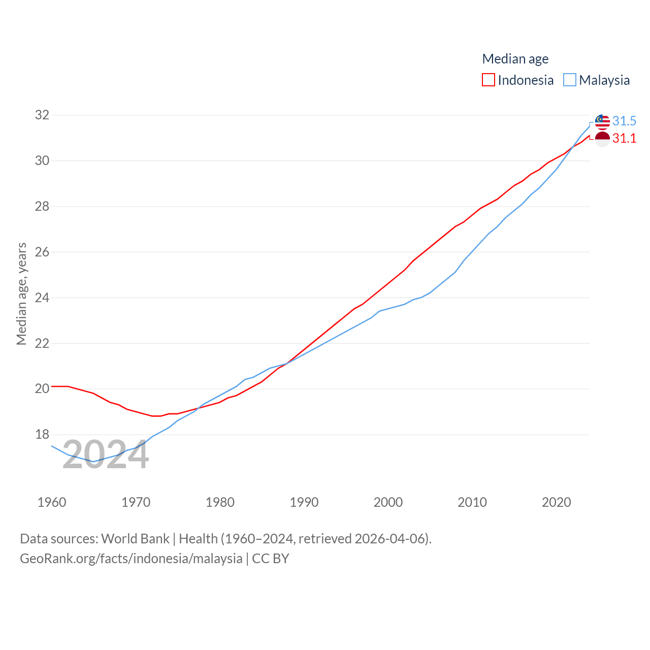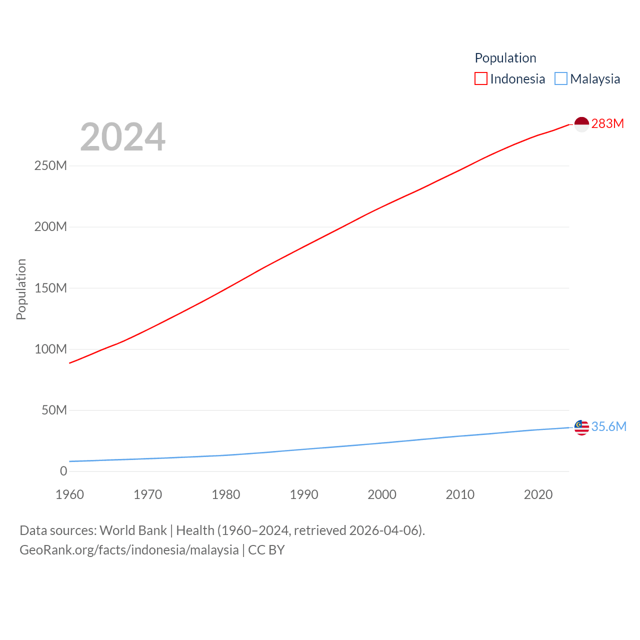 Indonesia has a population of 283M (ranked 4/197), compared with 35.6M in Malaysia (ranked 44/197). Indonesia's land area is 730,720 sq mi versus 126,854 sq mi for Malaysia (ranked 14th vs. 65th).