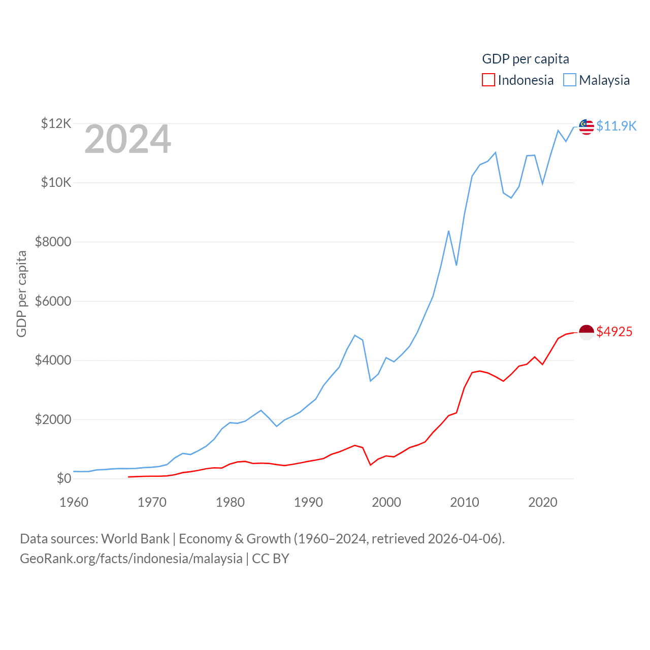 By GDP, Indonesia ranks 16/197 ($1.4T) and Malaysia ranks 38/197 ($422B). By GDP per capita, Indonesia ranks 121/197 ($4,925), while Malaysia ranks 79/197 ($11,874).