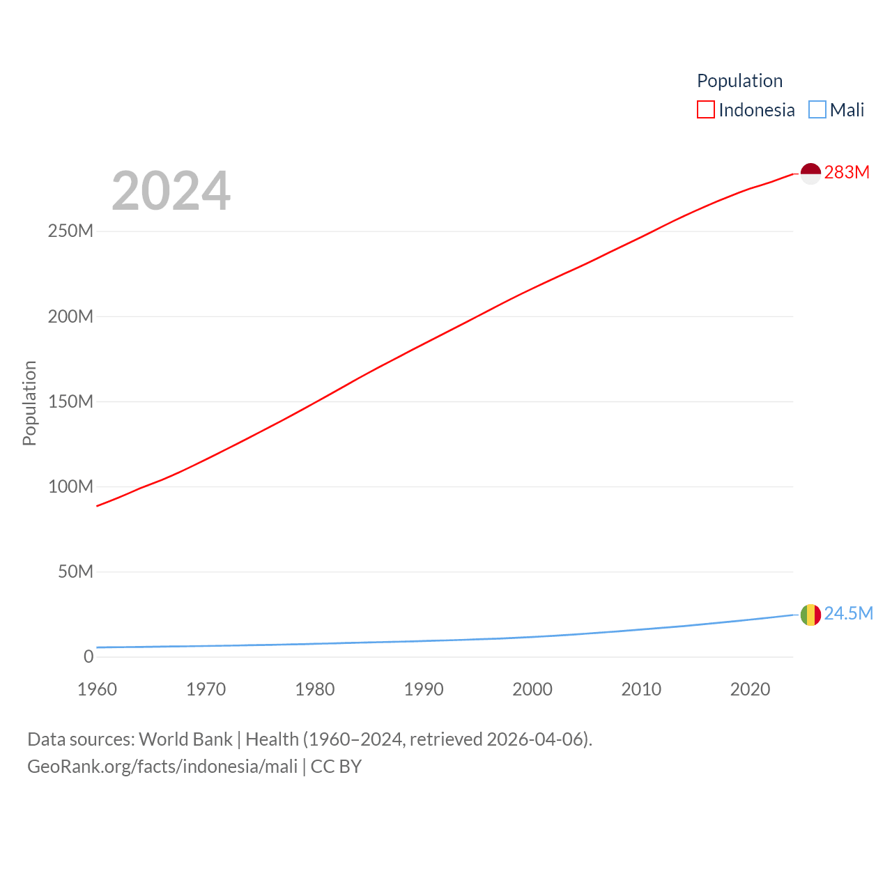 Indonesia has a population of 283M (ranked 4/197), compared with 24.5M in Mali (ranked 58/197). Indonesia's land area is 730,720 sq mi versus 471,118 sq mi for Mali (ranked 14th vs. 23rd).