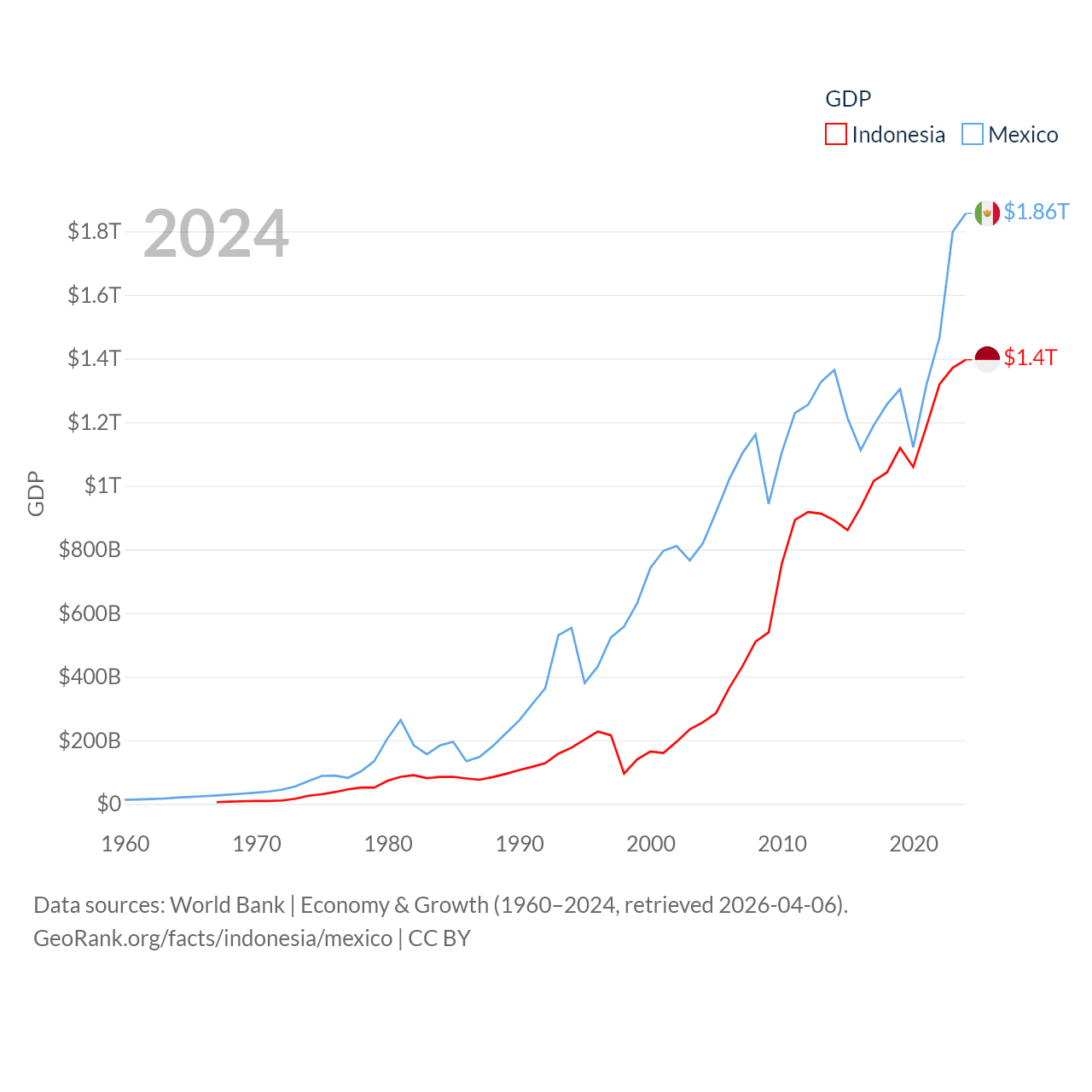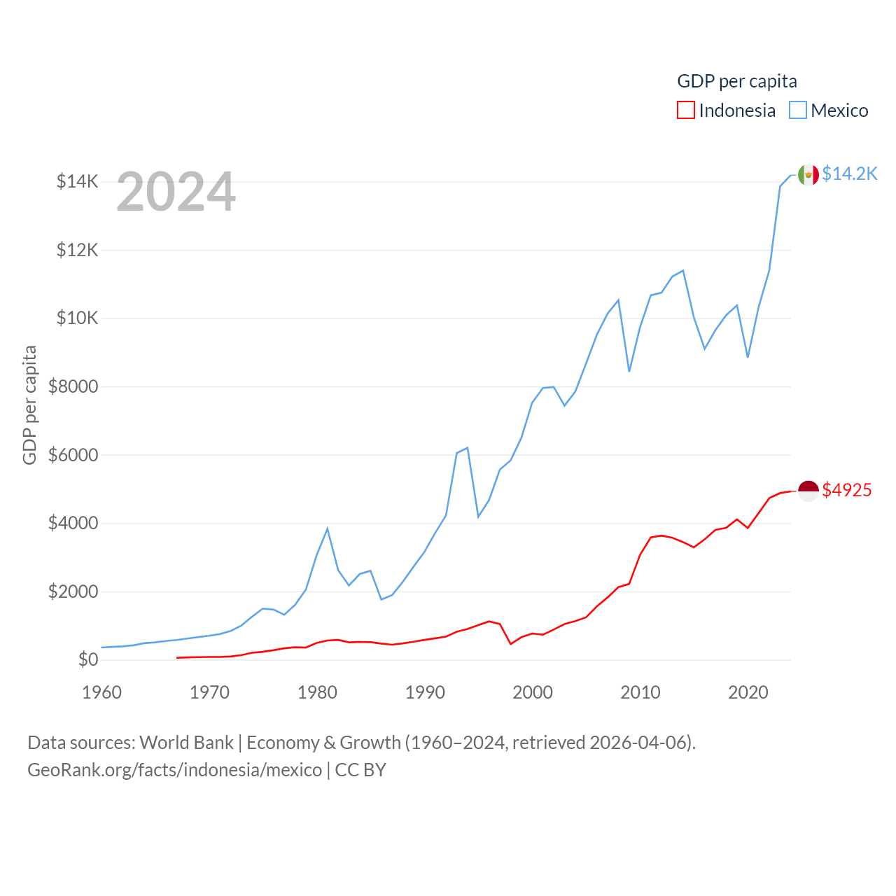 By GDP, Indonesia ranks 16/197 ($1.4T) and Mexico ranks 13/197 ($1.86T). By GDP per capita, Indonesia ranks 121/197 ($4,925), while Mexico ranks 69/197 ($14,186).