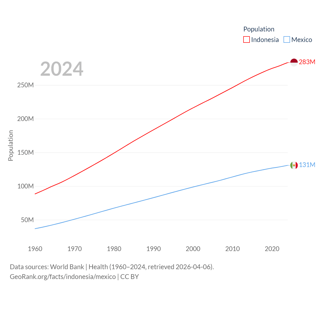 Indonesia has a population of 283M (ranked 4/197), compared with 131M in Mexico (ranked 11/197). Indonesia's land area is 730,720 sq mi versus 750,563 sq mi for Mexico (ranked 14th vs. 13th).