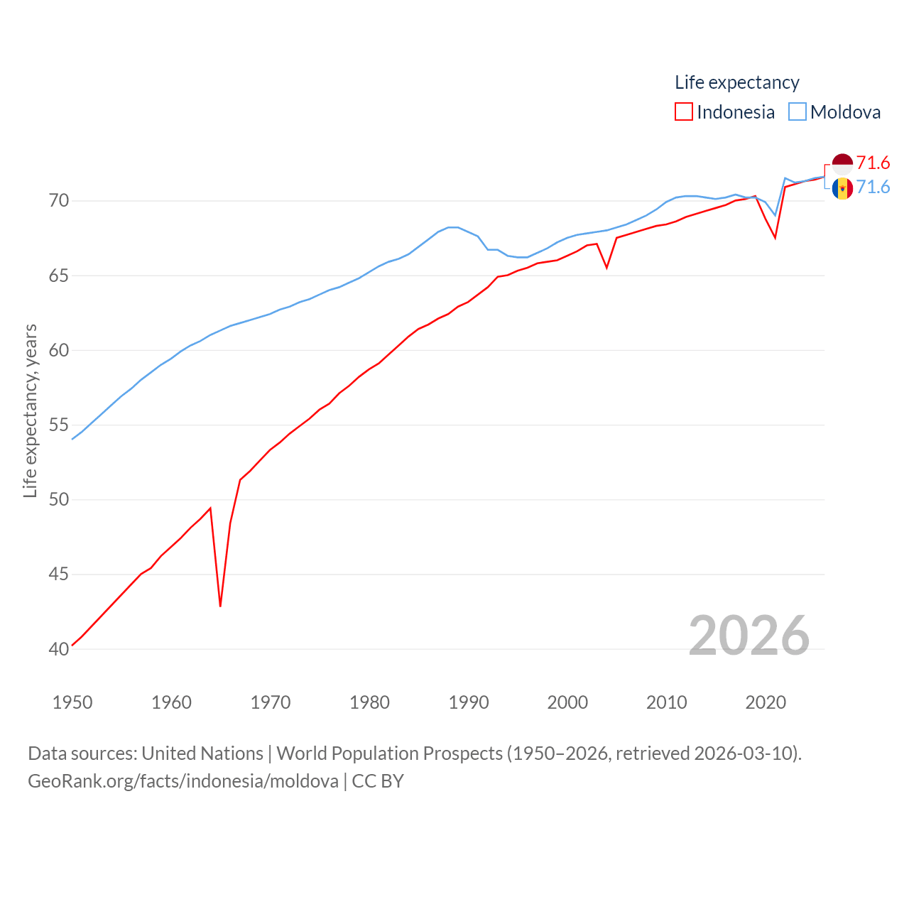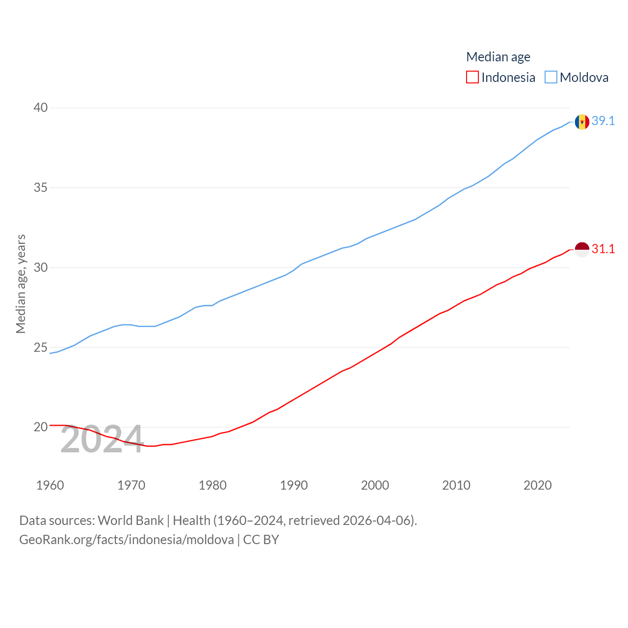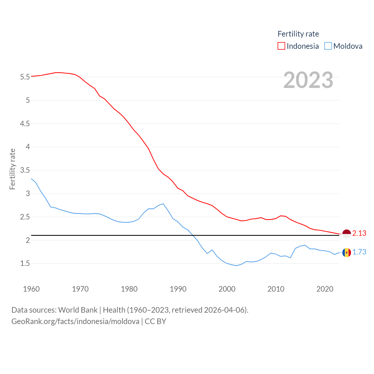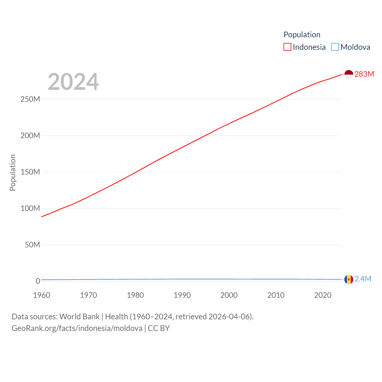 Indonesia has a population of 283M (ranked 4/197), compared with 2.4M in Moldova (ranked 143/197). Indonesia's land area is 730,720 sq mi versus 12,714 sq mi for Moldova (ranked 14th vs. 135th).