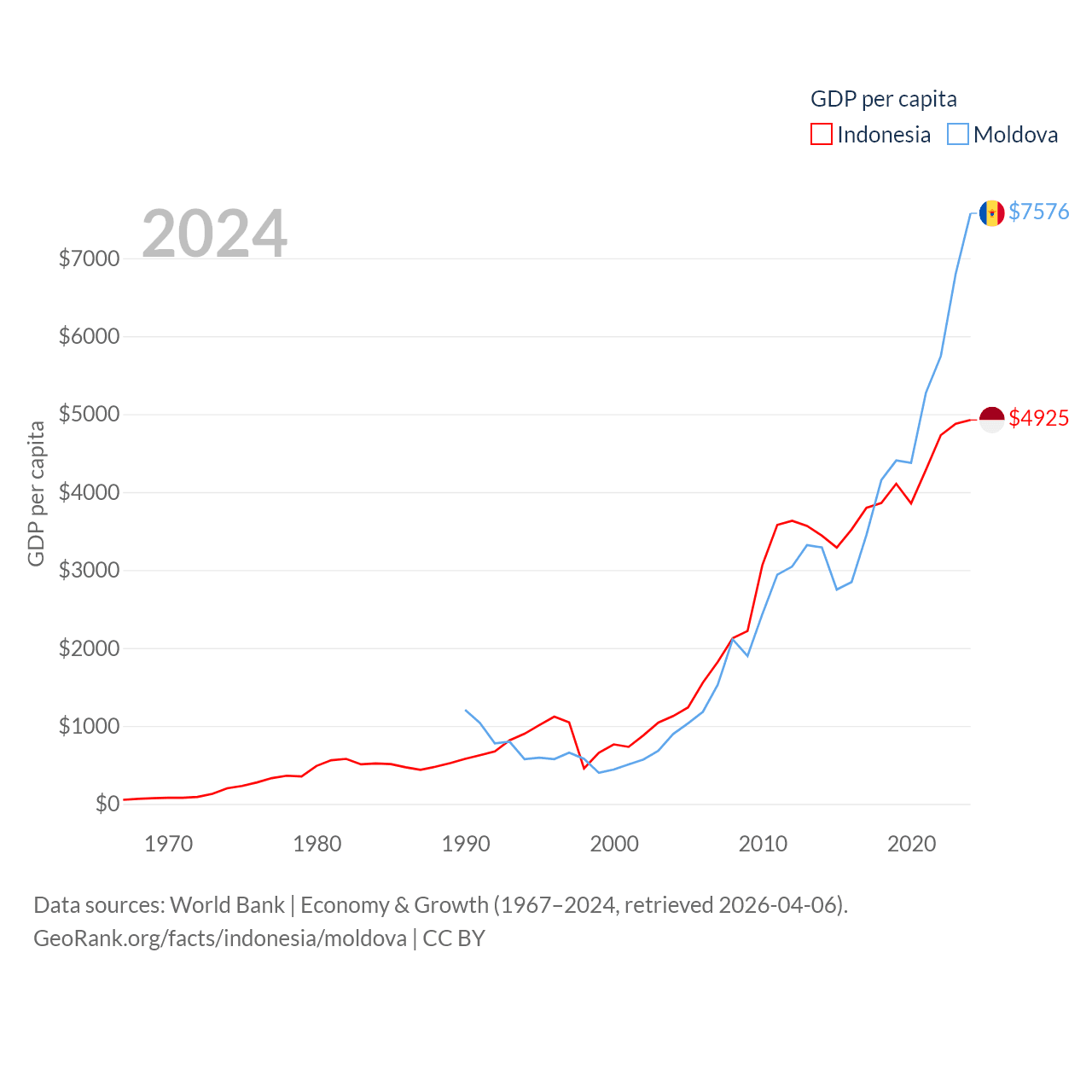By GDP, Indonesia ranks 16/197 ($1.4T) and Moldova ranks 134/197 ($18.2B). By GDP per capita, Indonesia ranks 121/197 ($4,925), while Moldova ranks 99/197 ($7,576).