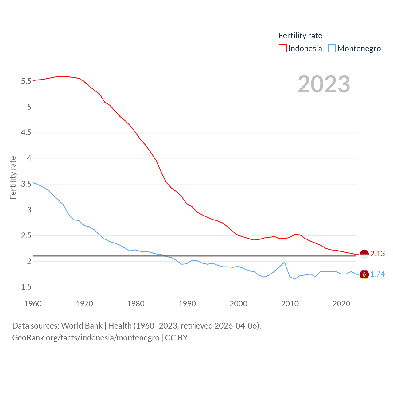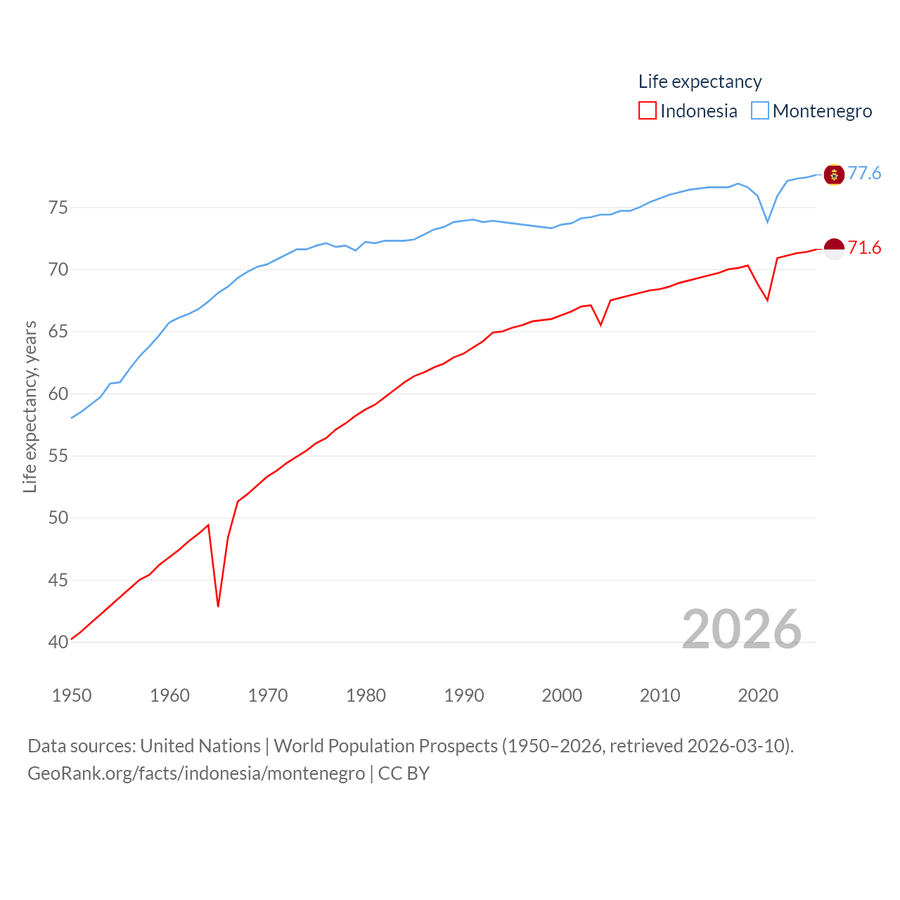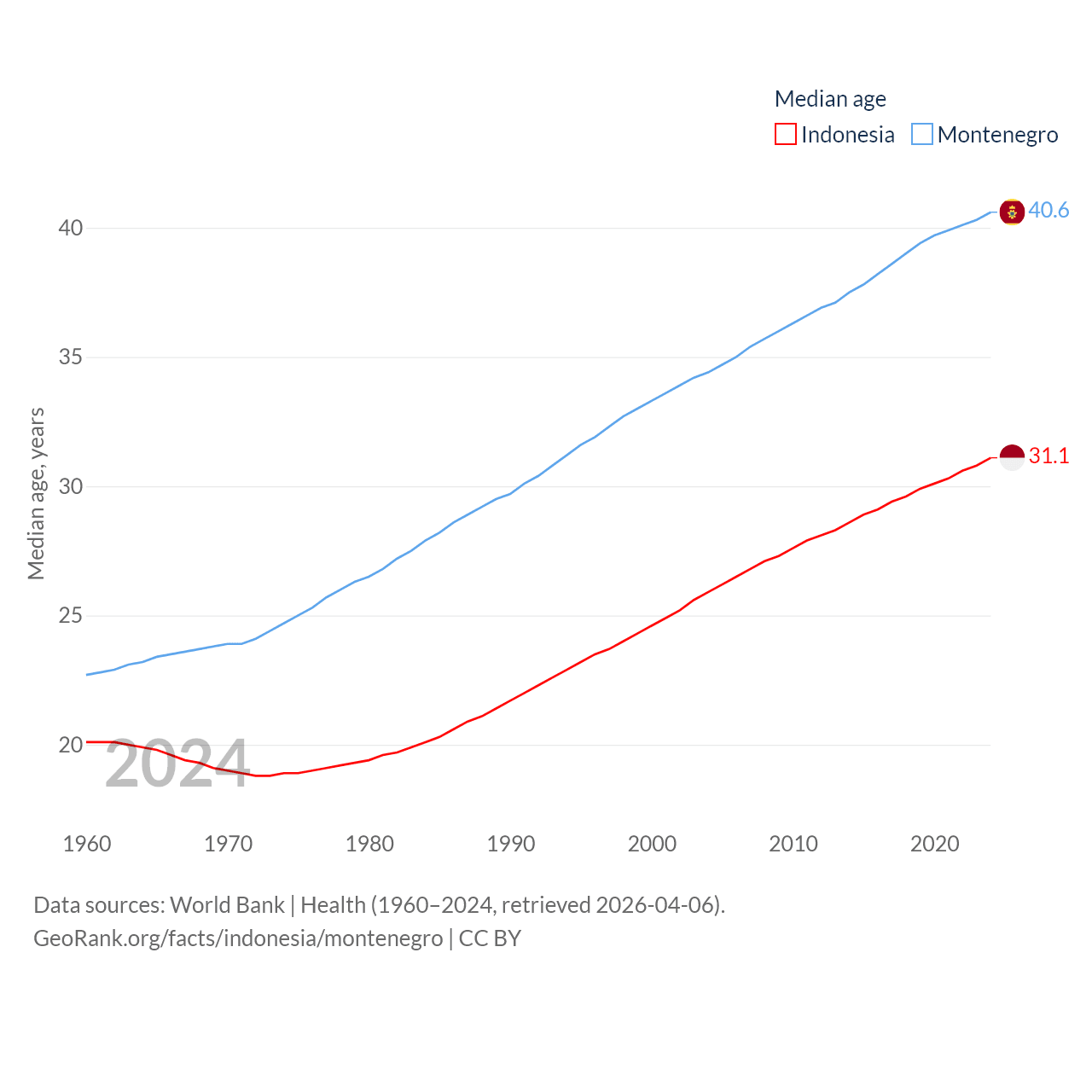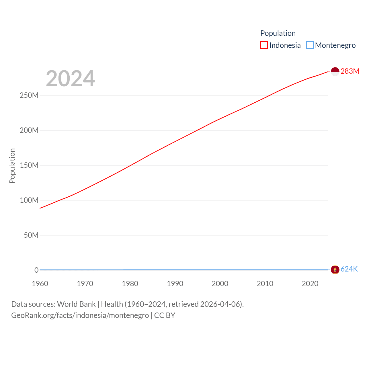Indonesia has a population of 283M (ranked 4/197), compared with 624K in Montenegro (ranked 166/197). Indonesia's land area is 730,720 sq mi versus 5,193 sq mi for Montenegro (ranked 14th vs. 156th).