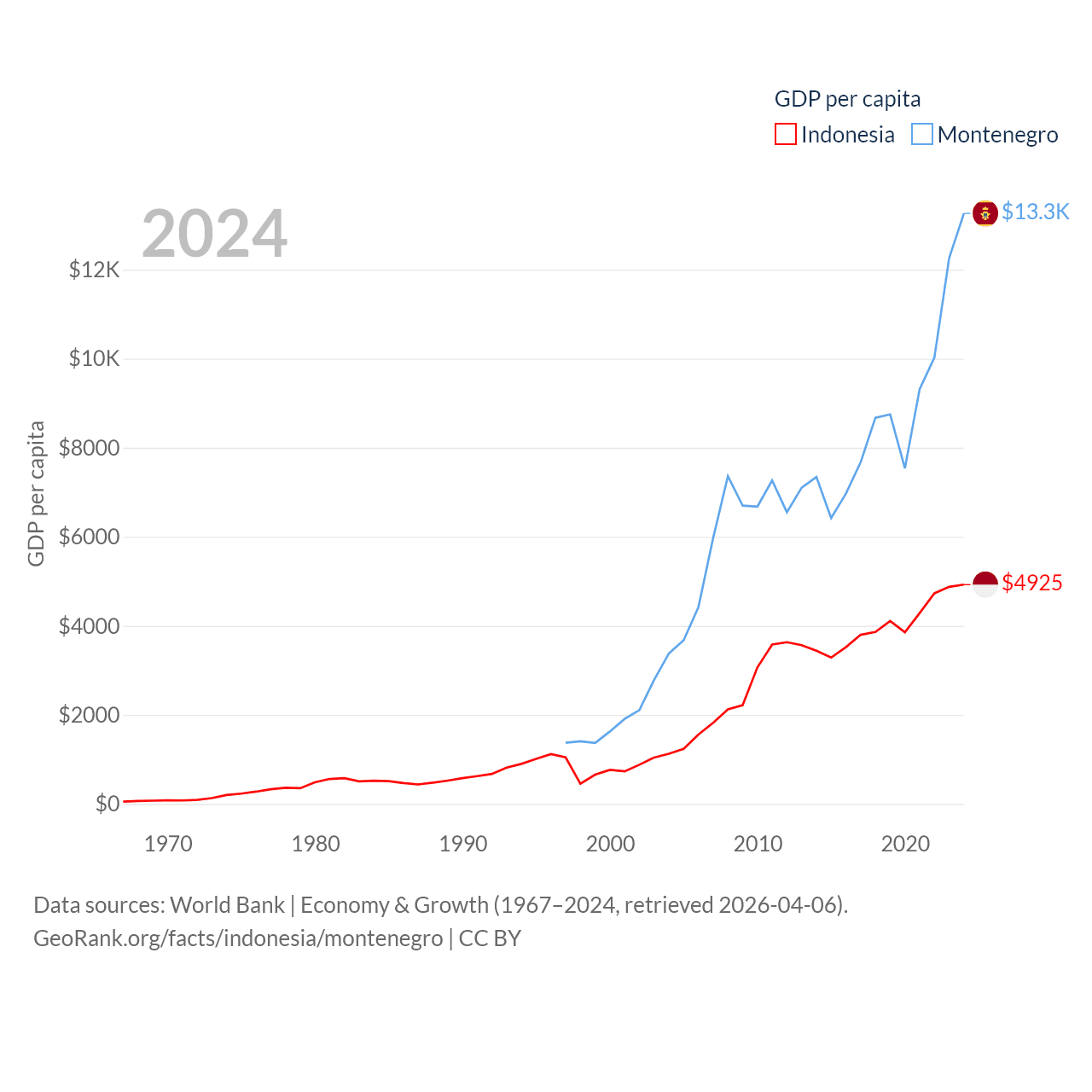 By GDP, Indonesia ranks 16/197 ($1.4T) and Montenegro ranks 155/197 ($8.27B). By GDP per capita, Indonesia ranks 121/197 ($4,925), while Montenegro ranks 77/197 ($13,263).