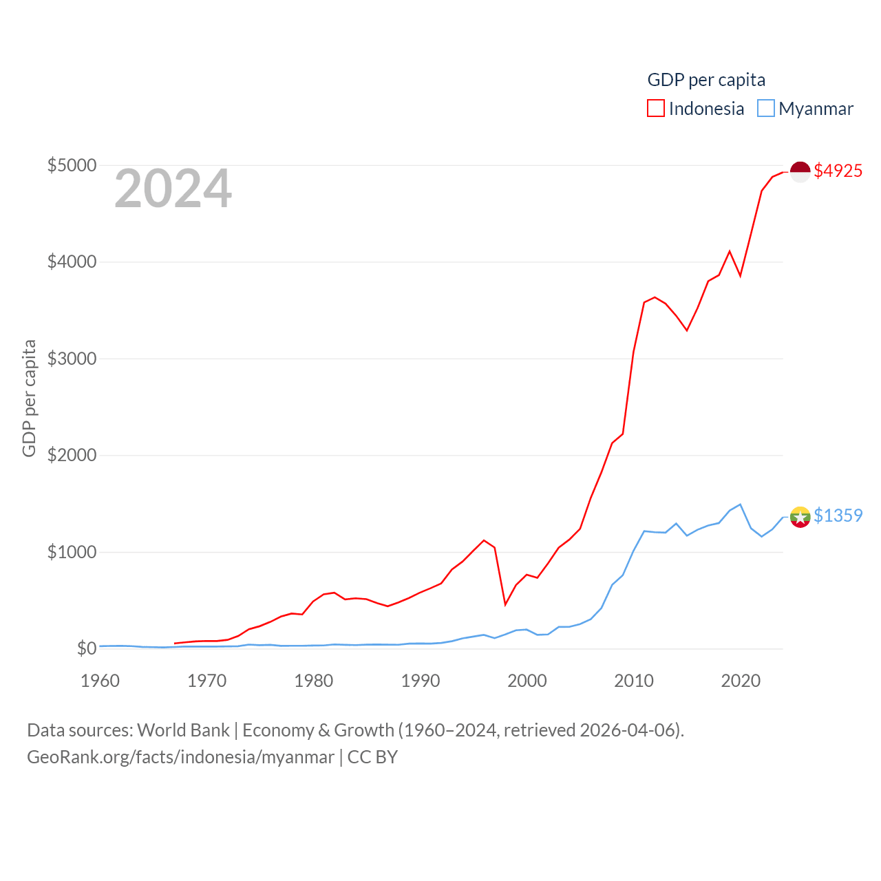 By GDP, Indonesia ranks 16/197 ($1.4T) and Myanmar ranks 85/197 ($74.1B). By GDP per capita, Indonesia ranks 121/197 ($4,925), while Myanmar ranks 165/197 ($1,359).