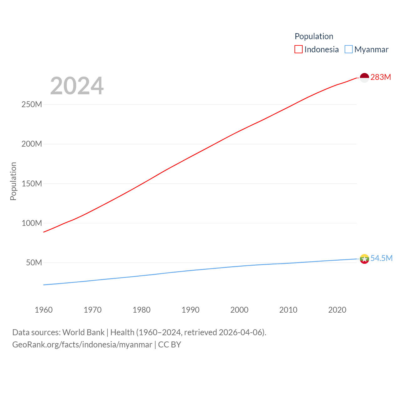 Indonesia has a population of 283M (ranked 4/197), compared with 54.5M in Myanmar (ranked 27/197). Indonesia's land area is 730,720 sq mi versus 251,997 sq mi for Myanmar (ranked 14th vs. 39th).