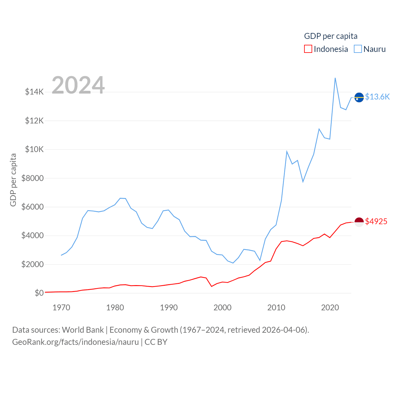 By GDP, Indonesia ranks 16/197 ($1.4T) and Nauru ranks 195/197 ($163M). By GDP per capita, Indonesia ranks 121/197 ($4,925), while Nauru ranks 74/197 ($13,609).
