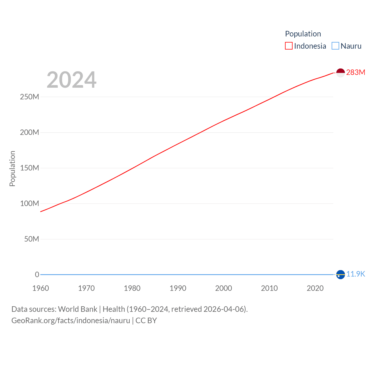 Indonesia has a population of 283M (ranked 4/197), compared with 11.9K in Nauru (ranked 195/197). Indonesia's land area is 730,720 sq mi versus 7.72 sq mi for Nauru (ranked 14th vs. 195th).