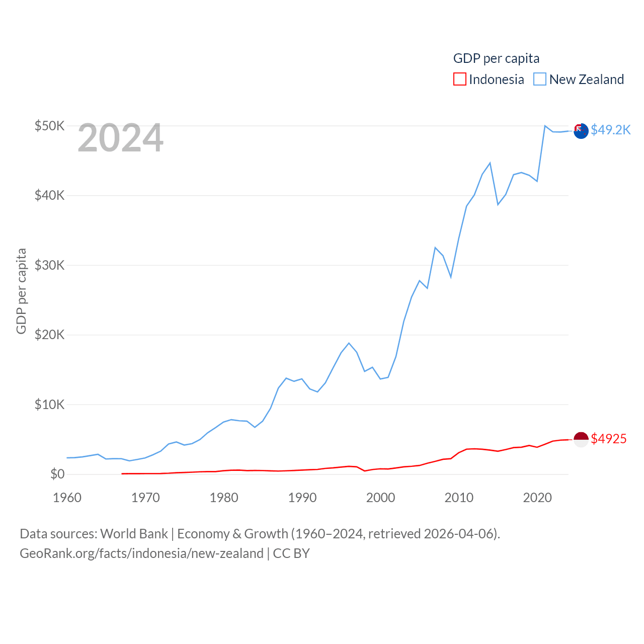 By GDP, Indonesia ranks 16/197 ($1.4T) and New Zealand ranks 52/197 ($260B). By GDP per capita, Indonesia ranks 121/197 ($4,925), while New Zealand ranks 26/197 ($49,205).