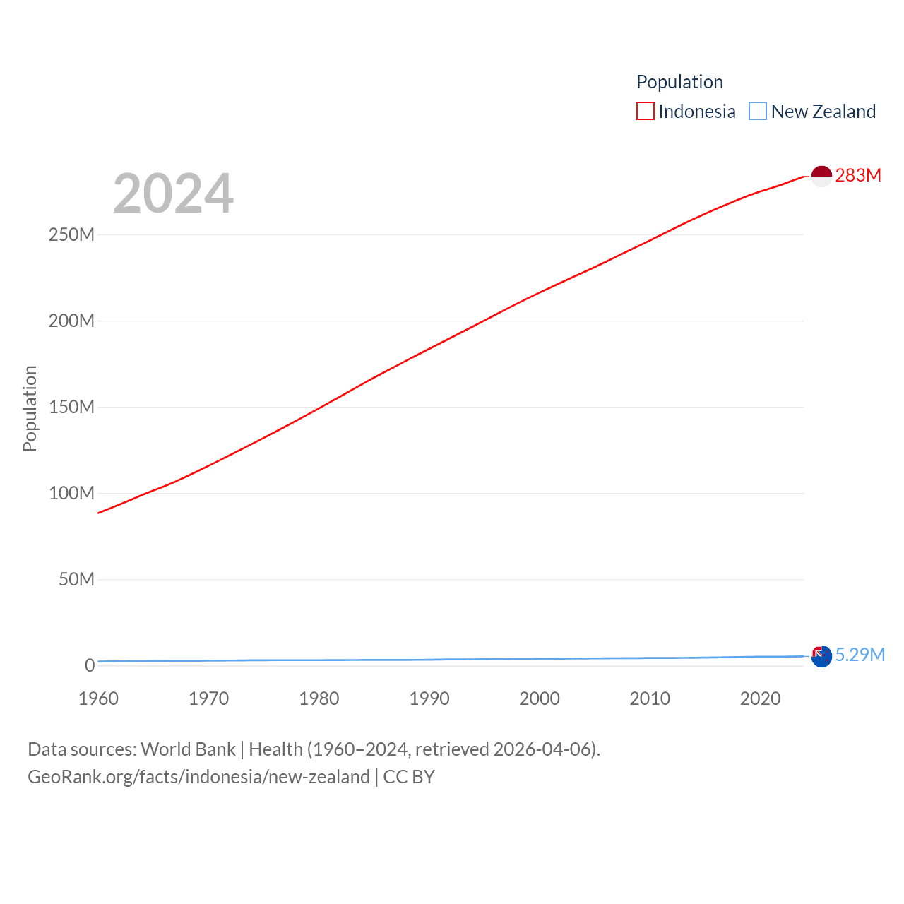 Indonesia has a population of 283M (ranked 4/197), compared with 5.29M in New Zealand (ranked 123/197). Indonesia's land area is 730,720 sq mi versus 101,665 sq mi for New Zealand (ranked 14th vs. 74th).