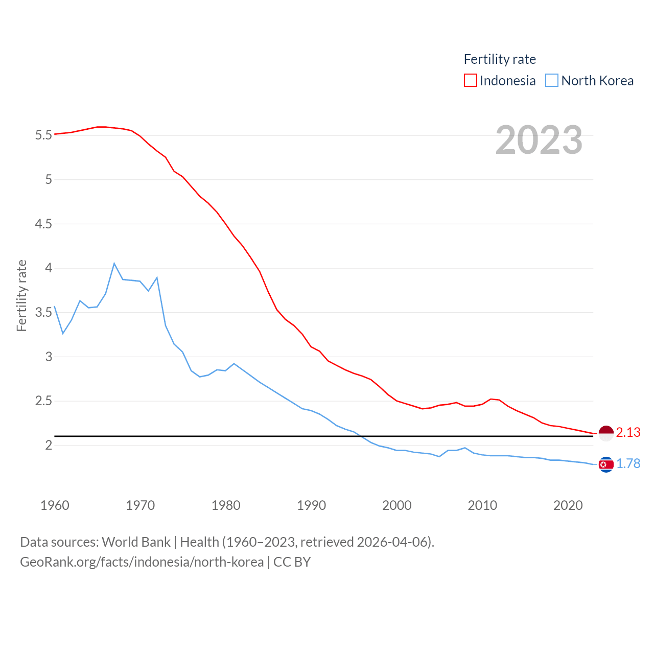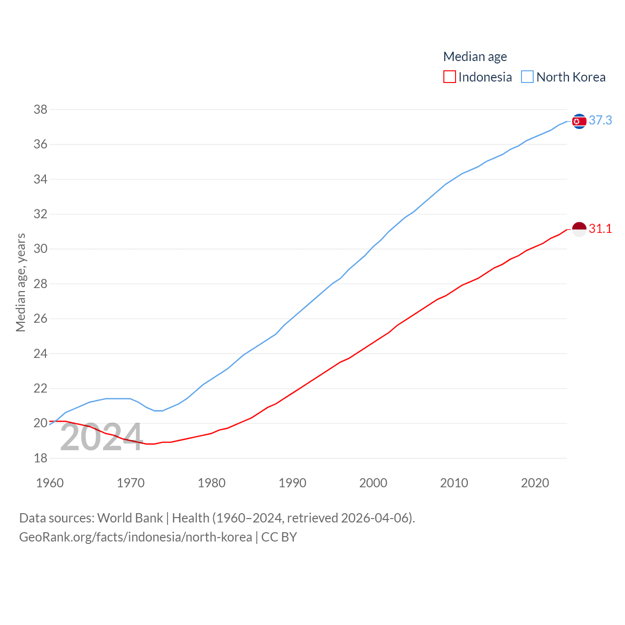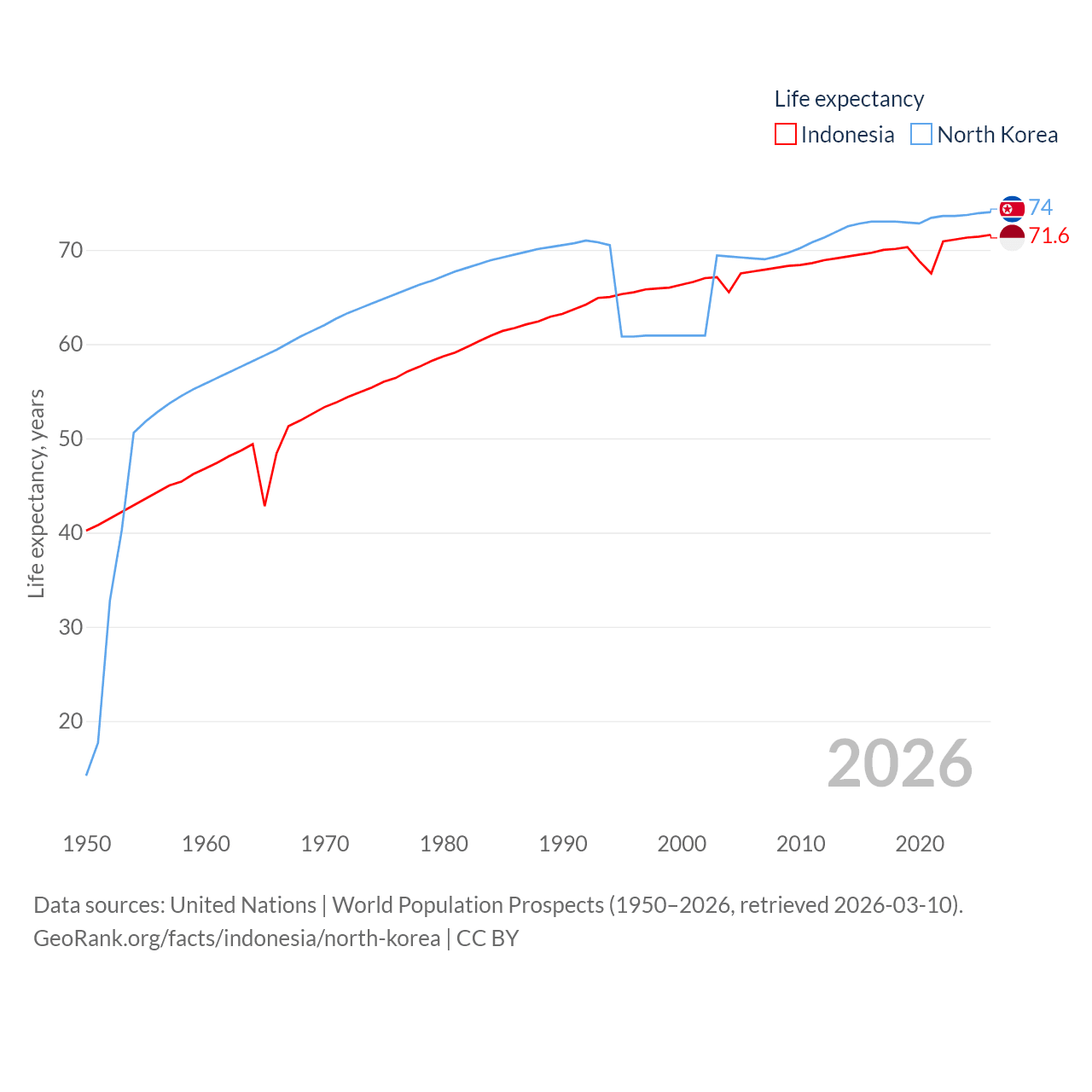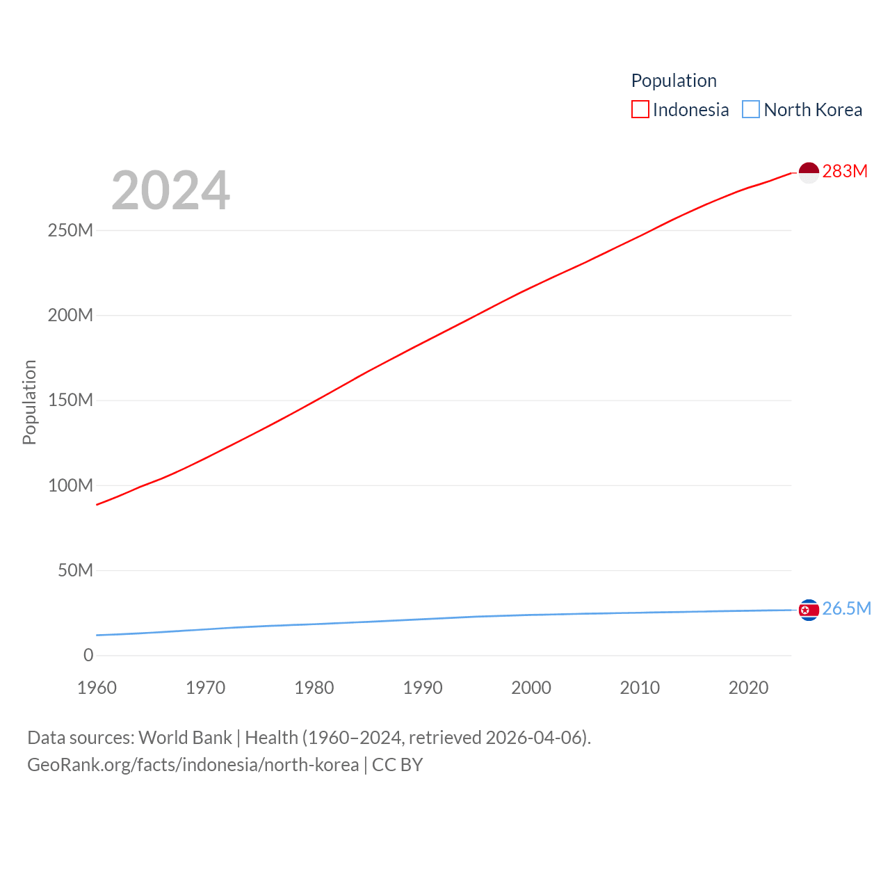 Indonesia has a population of 283M (ranked 4/197), compared with 26.5M in North Korea (ranked 56/197). Indonesia's land area is 730,720 sq mi versus 46,491 sq mi for North Korea (ranked 14th vs. 97th).