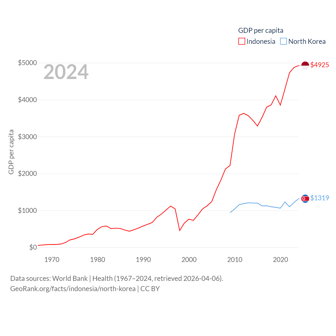 By GDP, Indonesia ranks 16/197 ($1.4T) and North Korea ranks 106/197 ($34.9B). By GDP per capita, Indonesia ranks 121/197 ($4,925), while North Korea ranks 168/197 ($1,319).