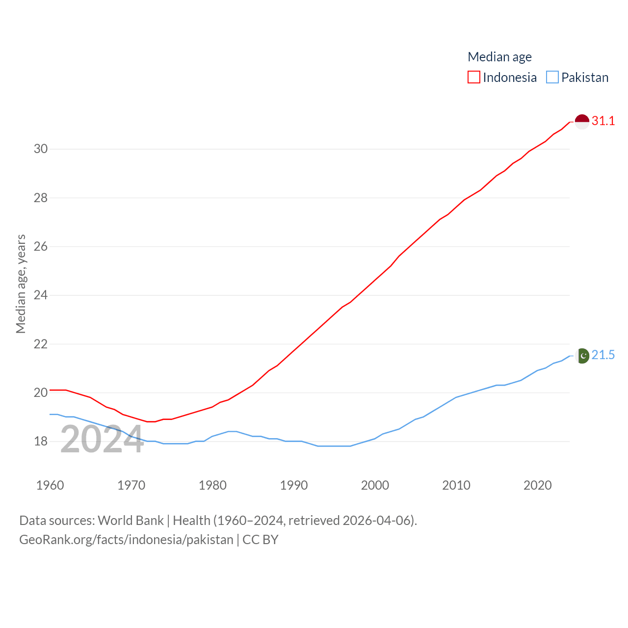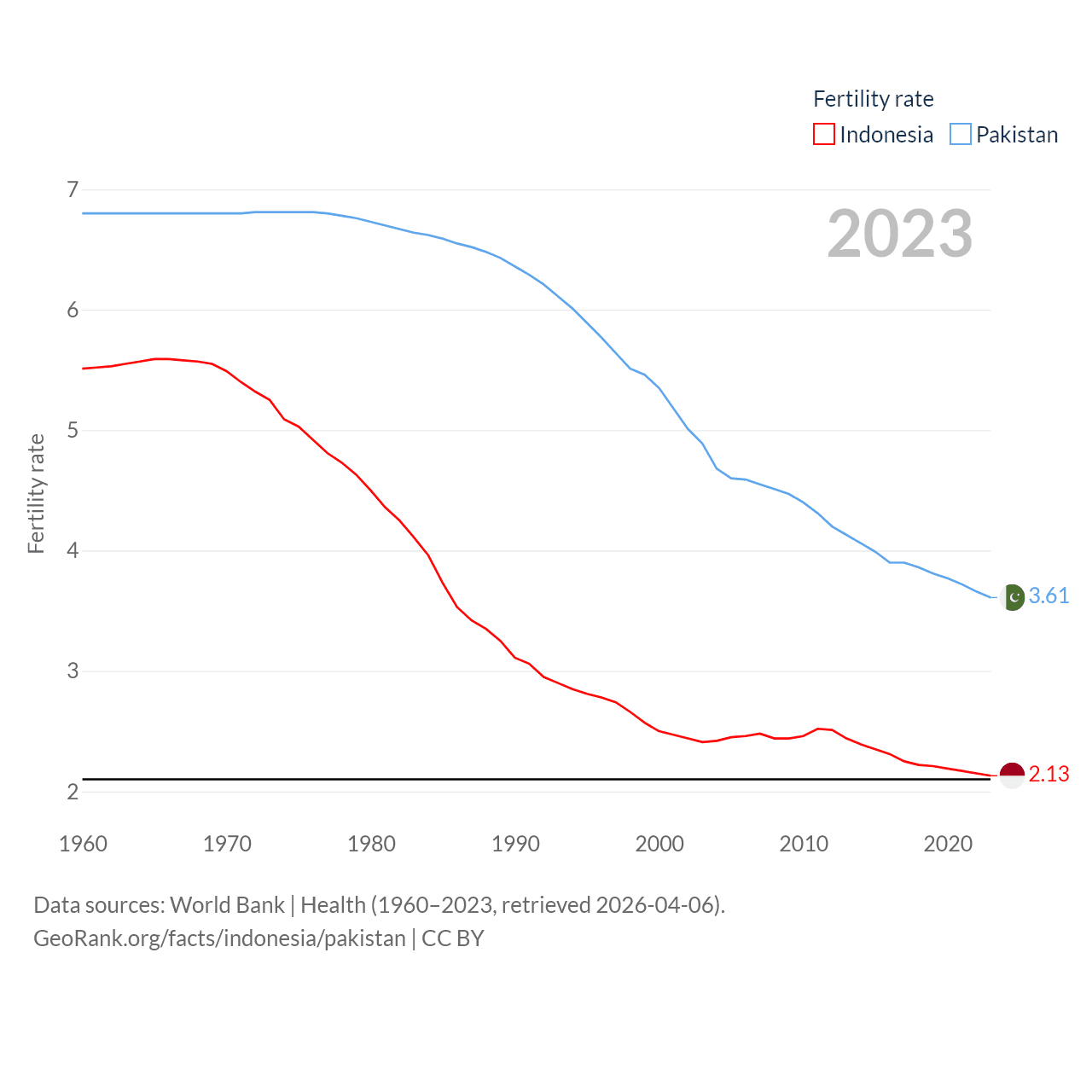 Indonesia has a population of 283M (ranked 4/197), compared with 251M in Pakistan (ranked 5/197). Indonesia's land area is 730,720 sq mi versus 297,638 sq mi for Pakistan (ranked 14th vs. 35th).