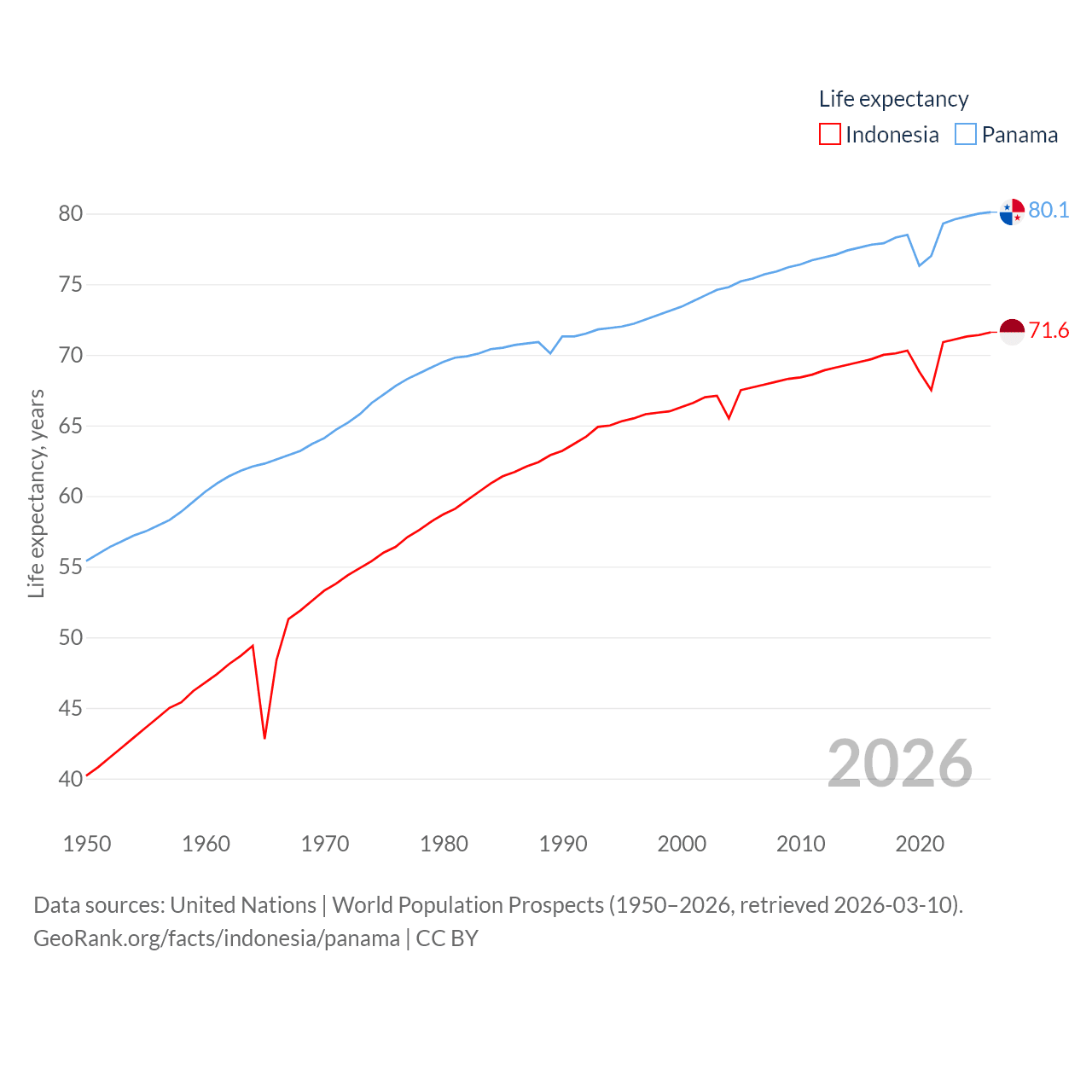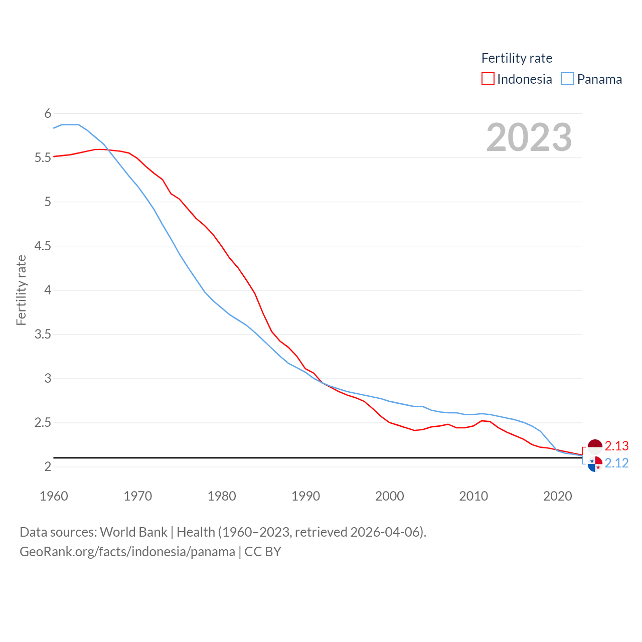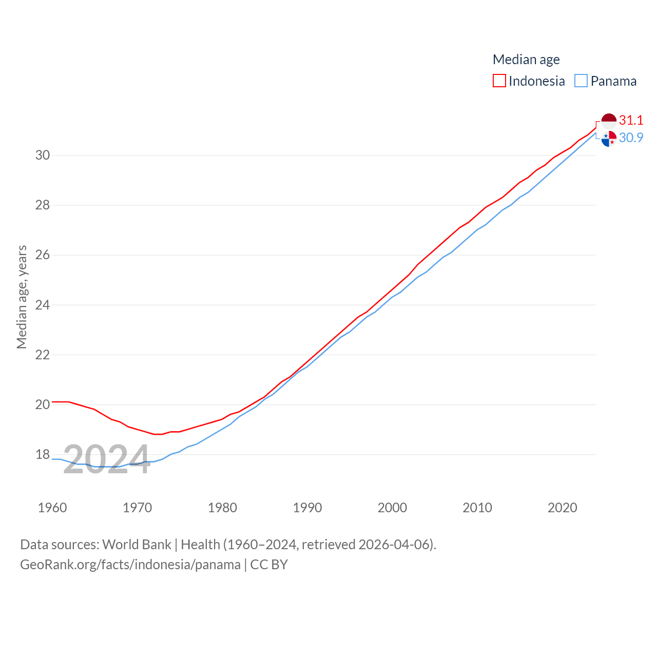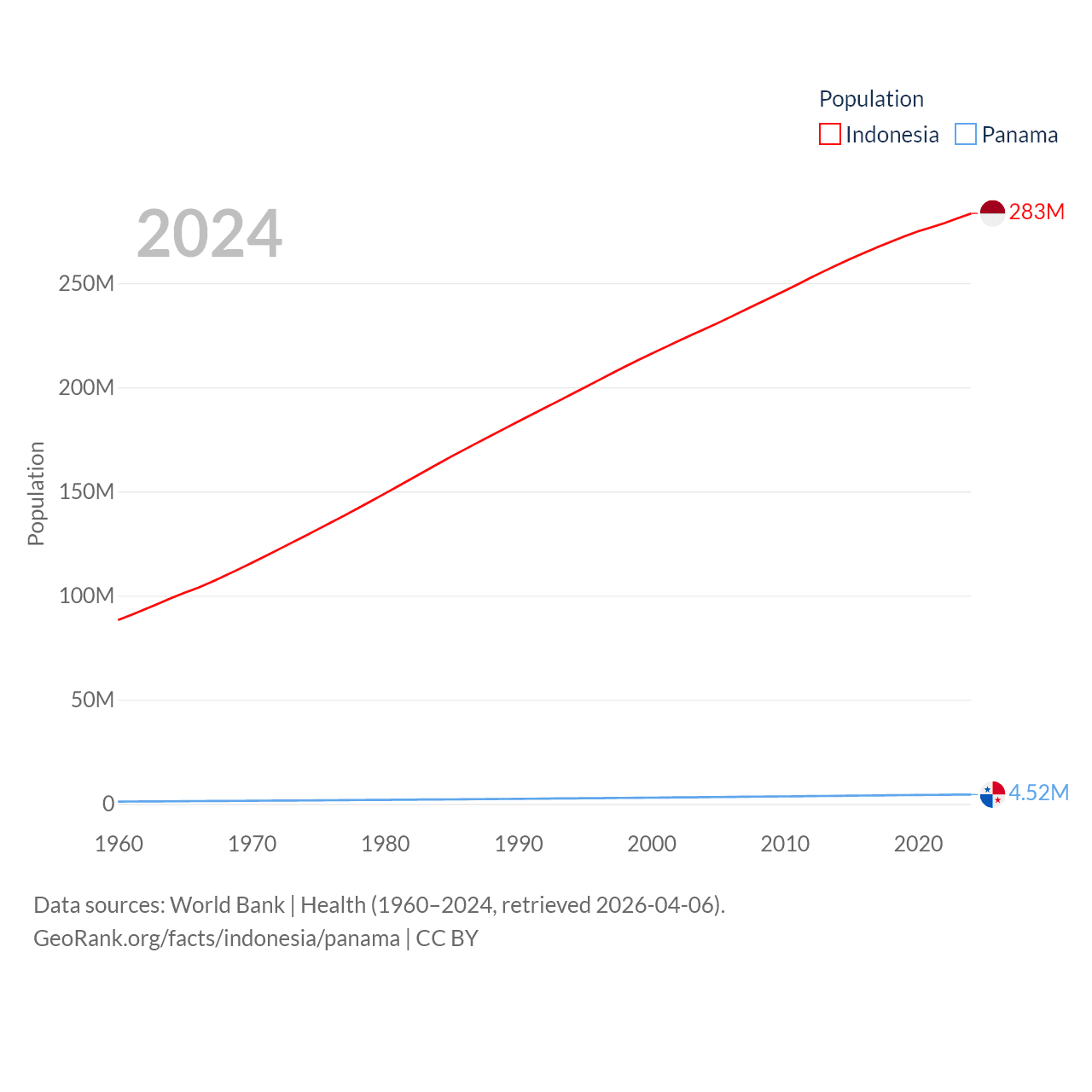 Indonesia has a population of 283M (ranked 4/197), compared with 4.52M in Panama (ranked 128/197). Indonesia's land area is 730,720 sq mi versus 28,641 sq mi for Panama (ranked 14th vs. 115th).