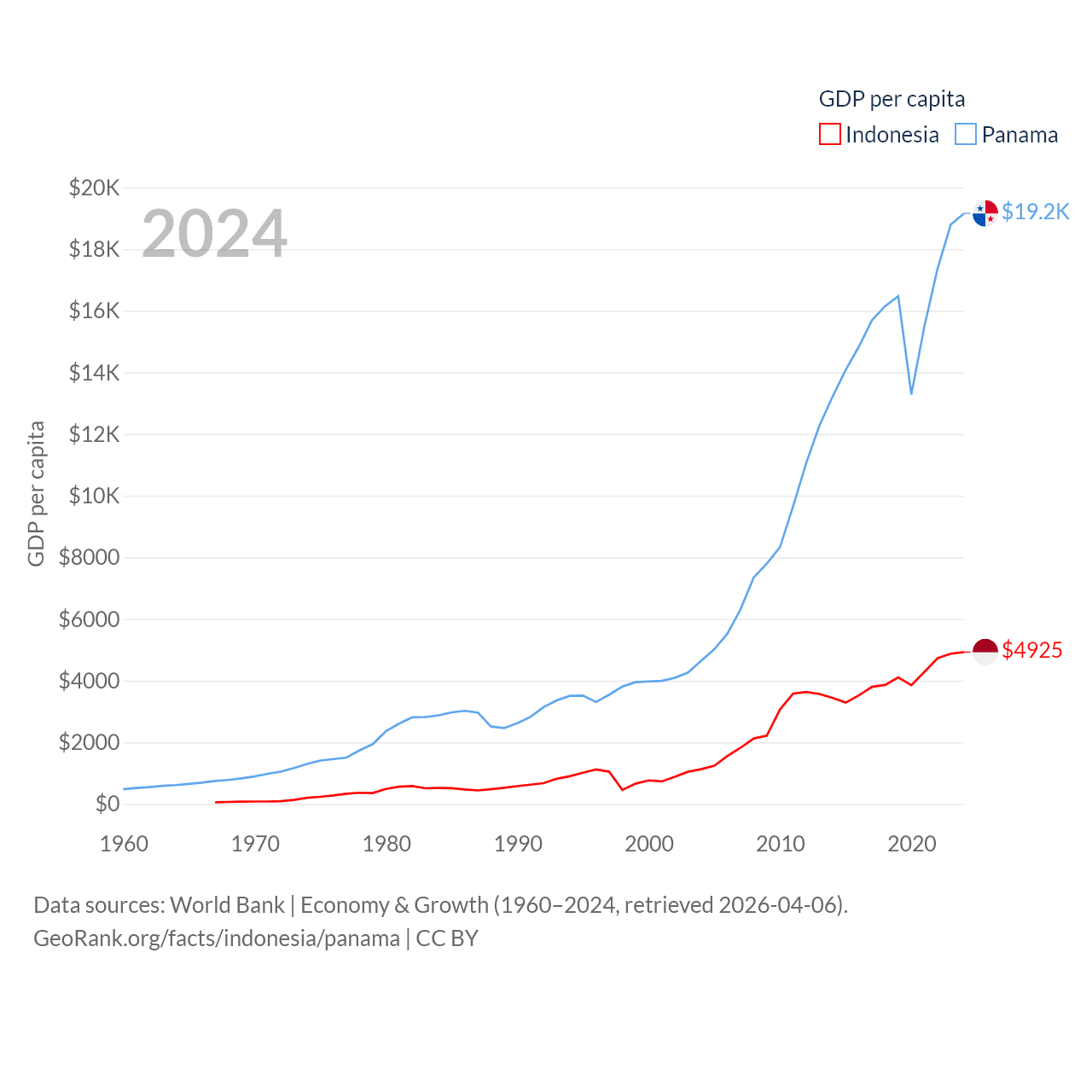 By GDP, Indonesia ranks 16/197 ($1.4T) and Panama ranks 78/197 ($86.5B). By GDP per capita, Indonesia ranks 121/197 ($4,925), while Panama ranks 60/197 ($19,161).