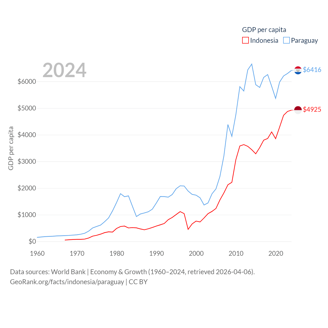 By GDP, Indonesia ranks 16/197 ($1.4T) and Paraguay ranks 98/197 ($44.5B). By GDP per capita, Indonesia ranks 121/197 ($4,925), while Paraguay ranks 109/197 ($6,416).