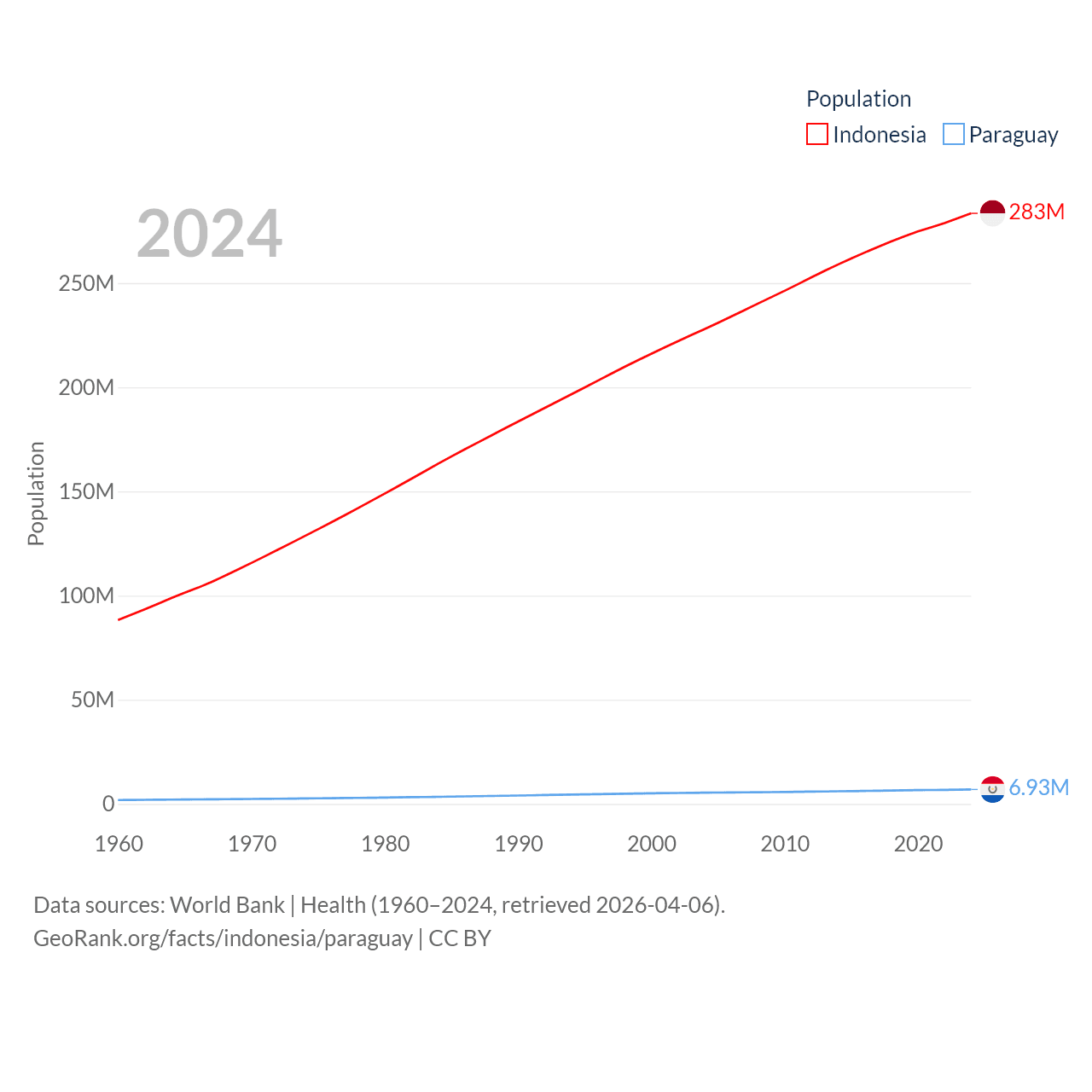 Indonesia has a population of 283M (ranked 4/197), compared with 6.93M in Paraguay (ranked 107/197). Indonesia's land area is 730,720 sq mi versus 152,901 sq mi for Paraguay (ranked 14th vs. 59th).