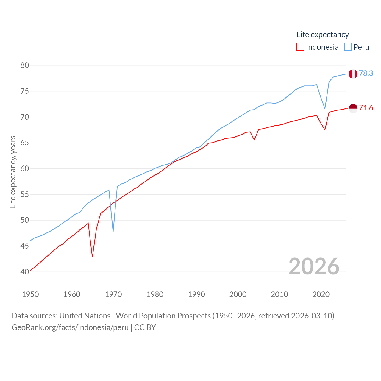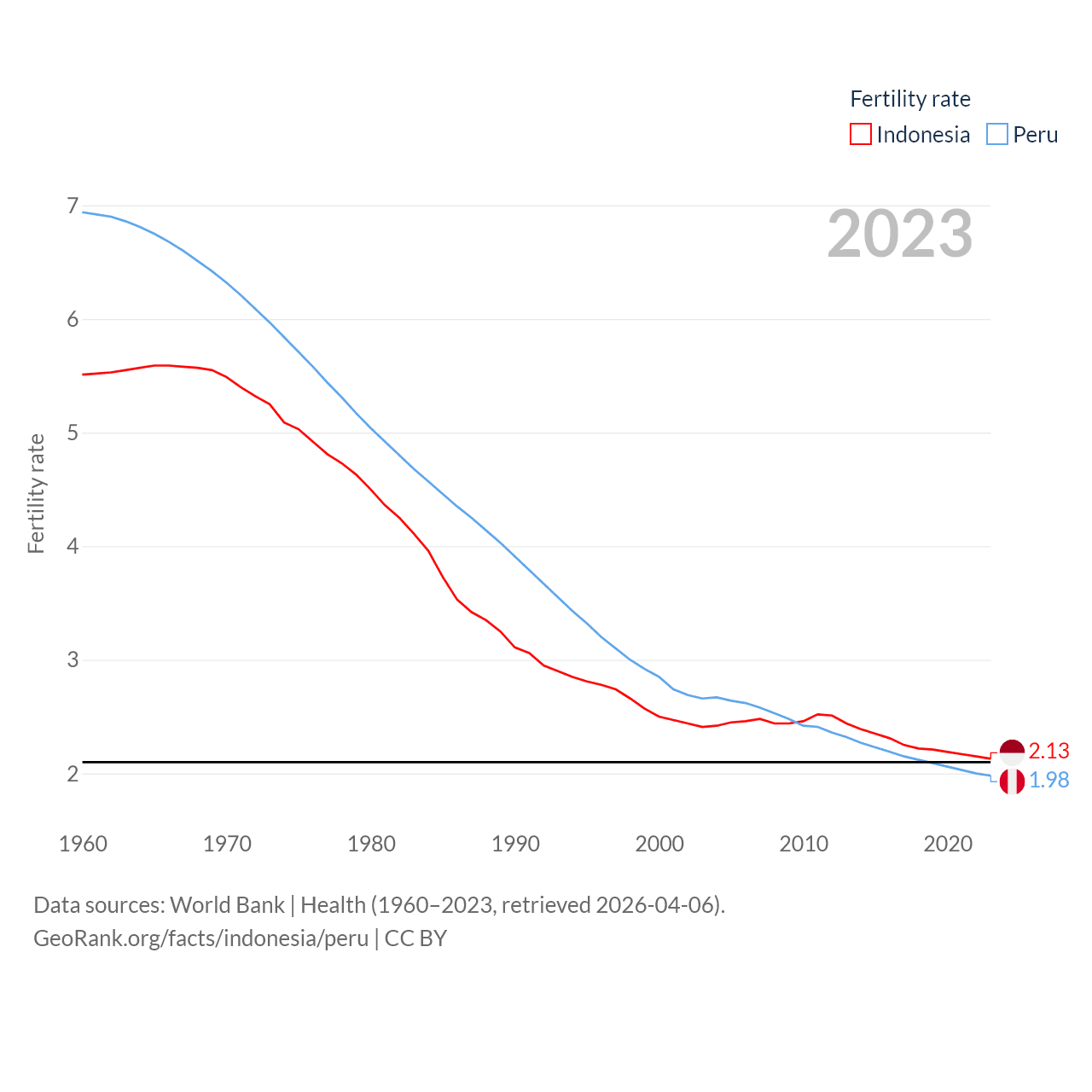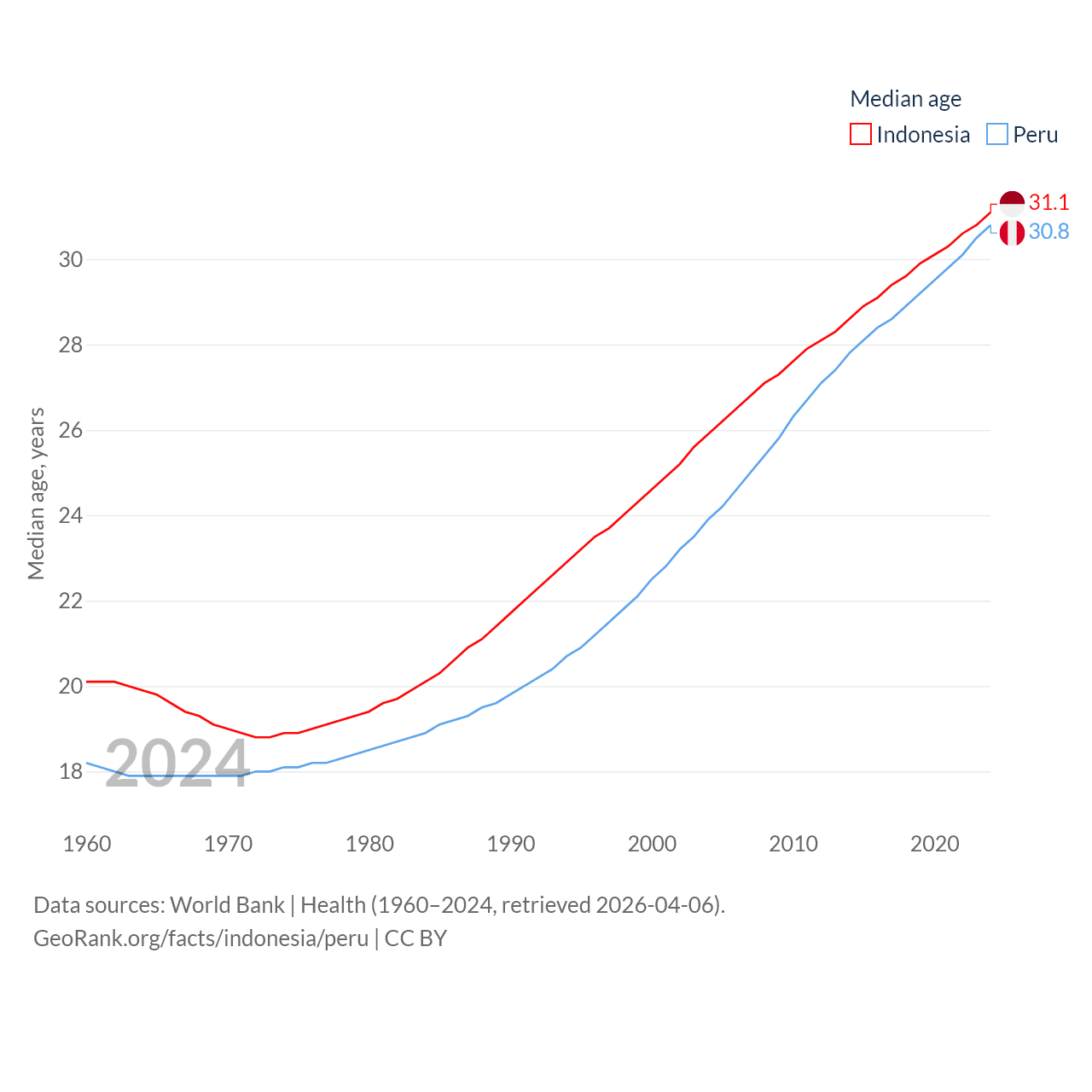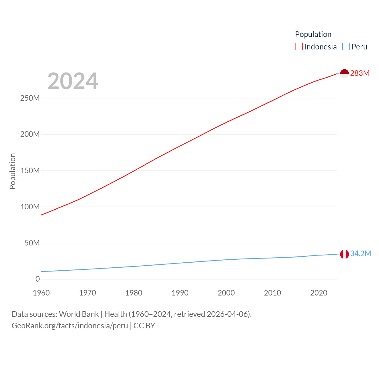 Indonesia has a population of 283M (ranked 4/197), compared with 34.2M in Peru (ranked 48/197). Indonesia's land area is 730,720 sq mi versus 494,211 sq mi for Peru (ranked 14th vs. 19th).