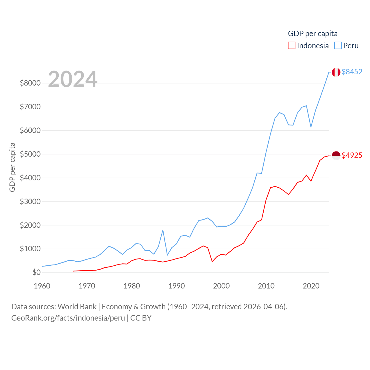 By GDP, Indonesia ranks 16/197 ($1.4T) and Peru ranks 49/197 ($289B). By GDP per capita, Indonesia ranks 121/197 ($4,925), while Peru ranks 91/197 ($8,452).