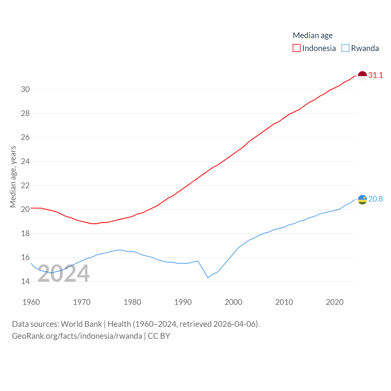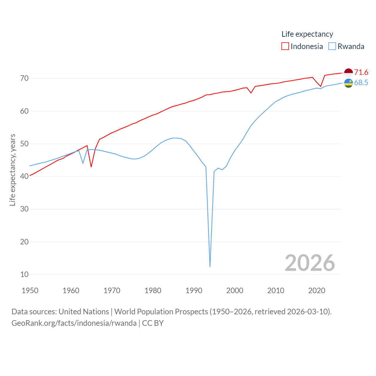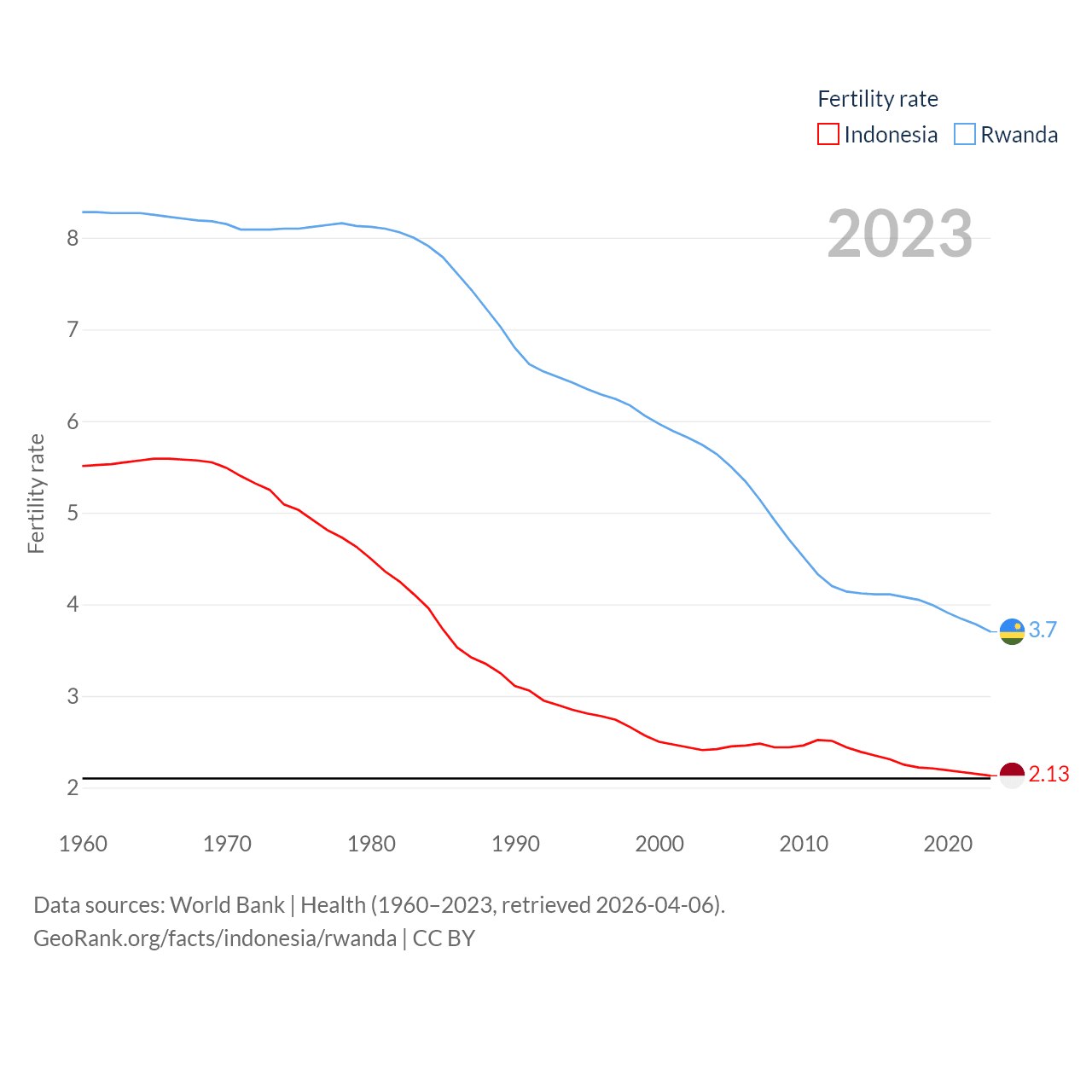 Indonesia has a population of 283M (ranked 4/197), compared with 14.3M in Rwanda (ranked 77/197). Indonesia's land area is 730,720 sq mi versus 9,525 sq mi for Rwanda (ranked 14th vs. 146th).