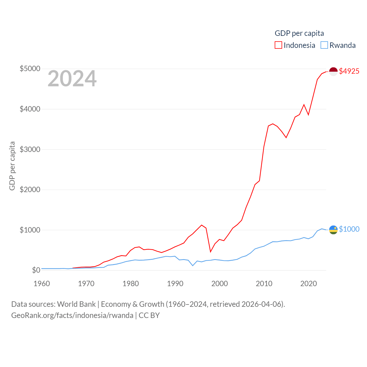 By GDP, Indonesia ranks 16/197 ($1.4T) and Rwanda ranks 144/197 ($14.3B). By GDP per capita, Indonesia ranks 121/197 ($4,925), while Rwanda ranks 178/197 ($1,000).