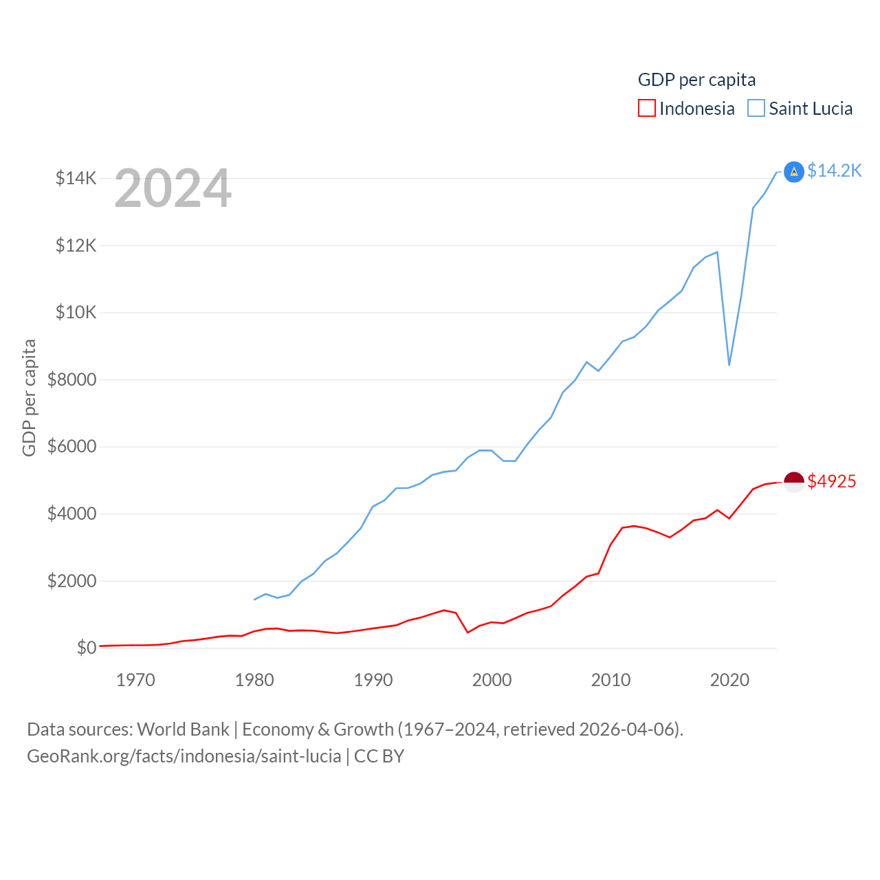 By GDP, Indonesia ranks 16/197 ($1.4T) and Saint Lucia ranks 173/197 ($2.55B). By GDP per capita, Indonesia ranks 121/197 ($4,925), while Saint Lucia ranks 70/197 ($14,182).