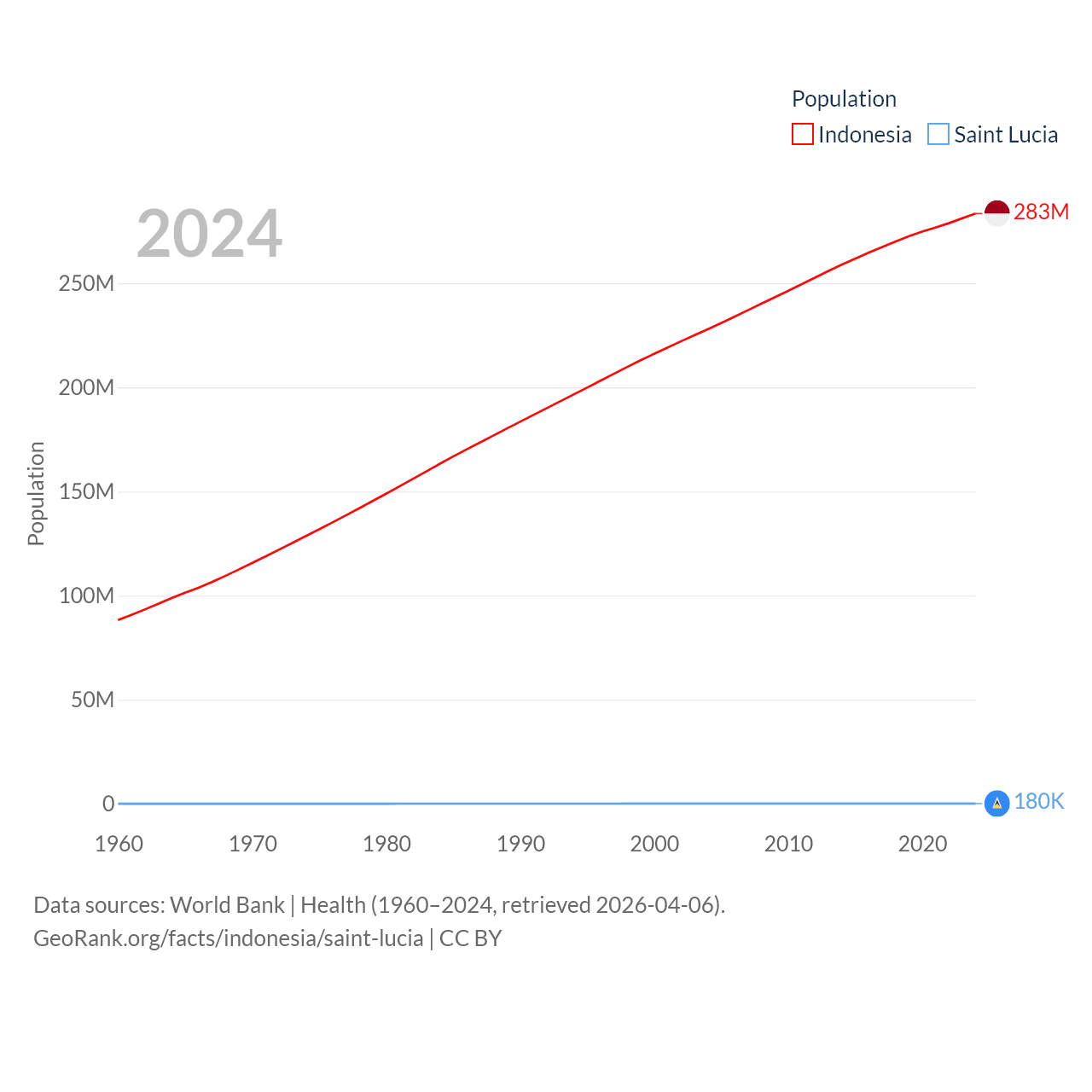 Indonesia has a population of 283M (ranked 4/197), compared with 180K in Saint Lucia (ranked 178/197). Indonesia's land area is 730,720 sq mi versus 235.5 sq mi for Saint Lucia (ranked 14th vs. 178th).