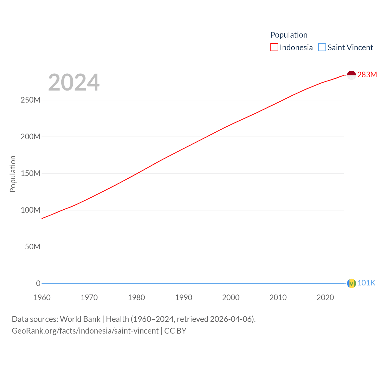 Indonesia has a population of 283M (ranked 4/197), compared with 101K in Saint Vincent (ranked 184/197). Indonesia's land area is 730,720 sq mi versus 150.6 sq mi for Saint Vincent (ranked 14th vs. 185th).