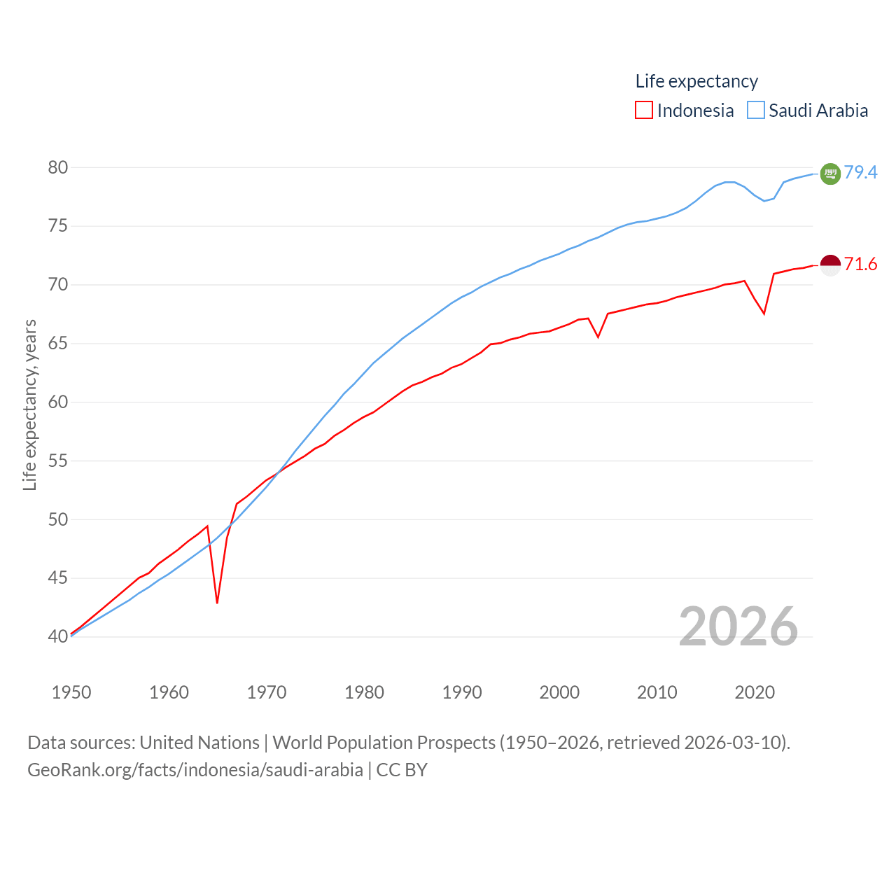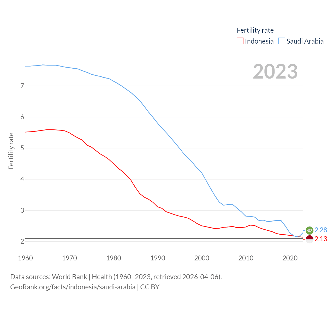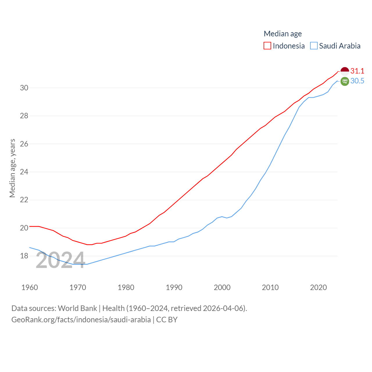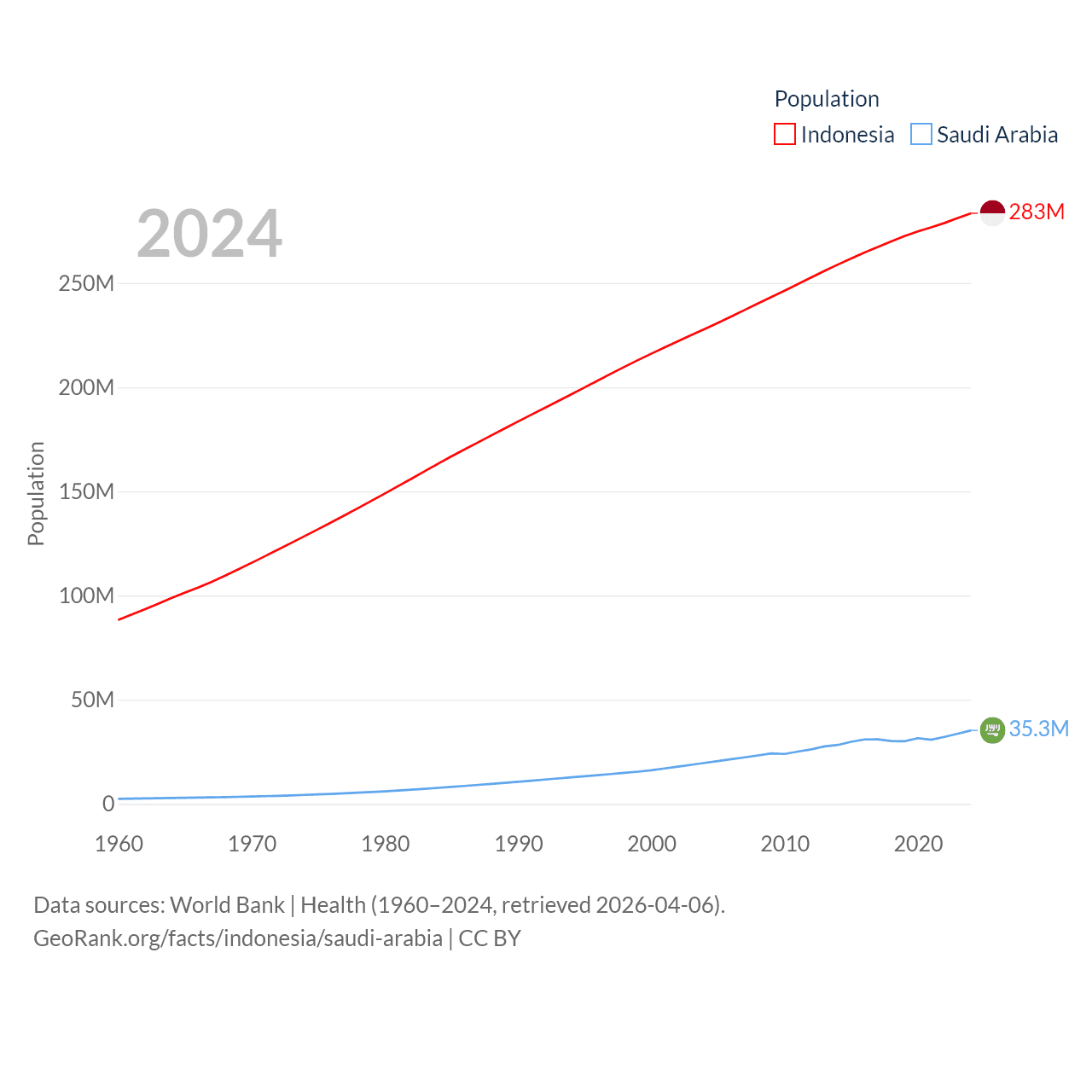 Indonesia has a population of 283M (ranked 4/197), compared with 35.3M in Saudi Arabia (ranked 45/197). Indonesia's land area is 730,720 sq mi versus 830,000 sq mi for Saudi Arabia (ranked 14th vs. 12th).