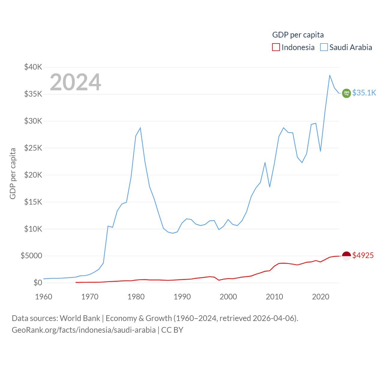 By GDP, Indonesia ranks 16/197 ($1.4T) and Saudi Arabia ranks 18/197 ($1.24T). By GDP per capita, Indonesia ranks 121/197 ($4,925), while Saudi Arabia ranks 33/197 ($35,122).
