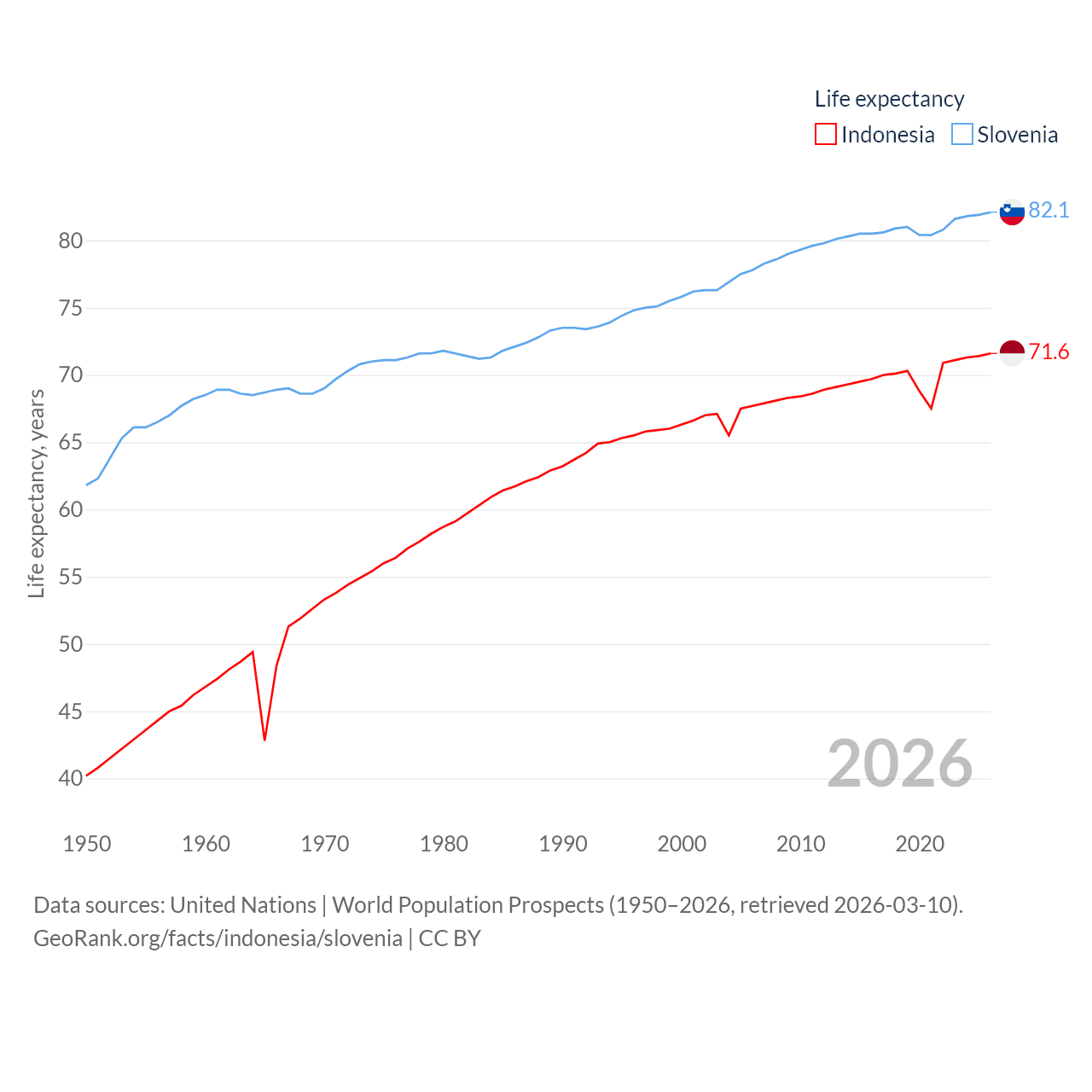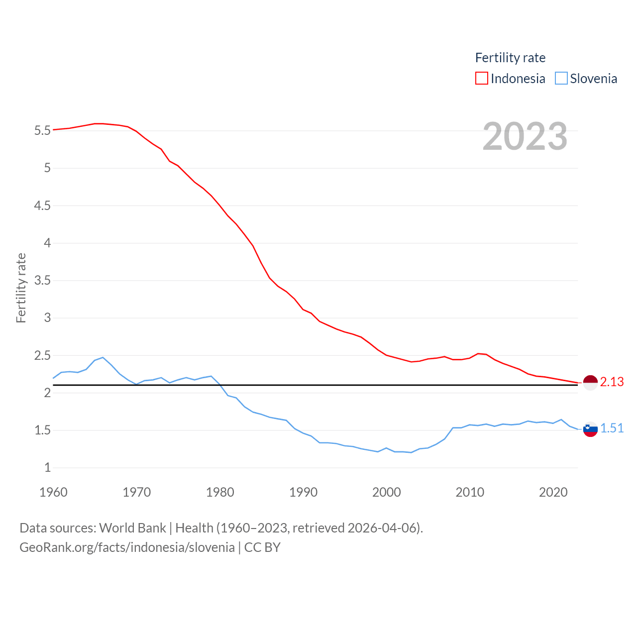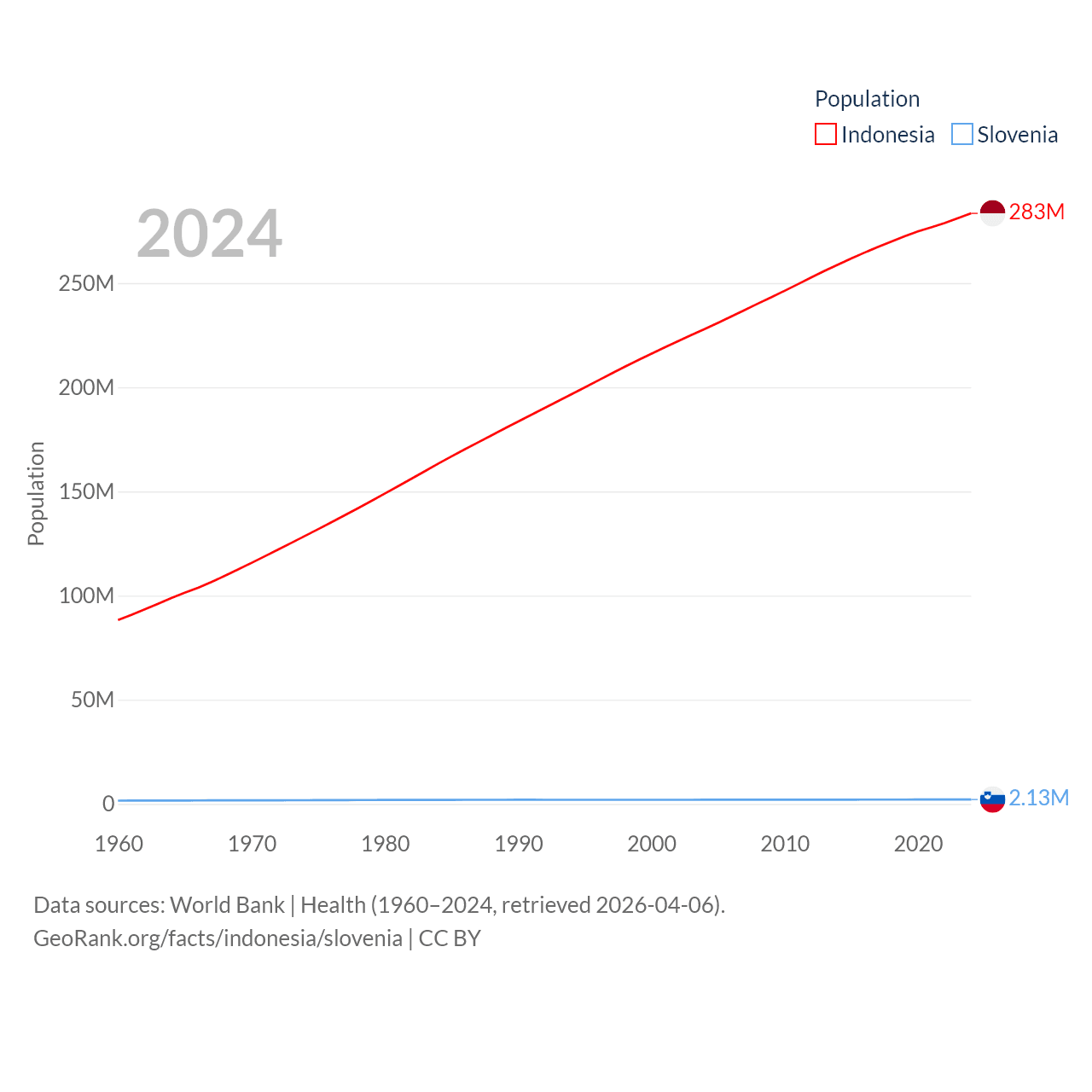 Indonesia has a population of 283M (ranked 4/197), compared with 2.13M in Slovenia (ranked 147/197). Indonesia's land area is 730,720 sq mi versus 7,774 sq mi for Slovenia (ranked 14th vs. 151st).