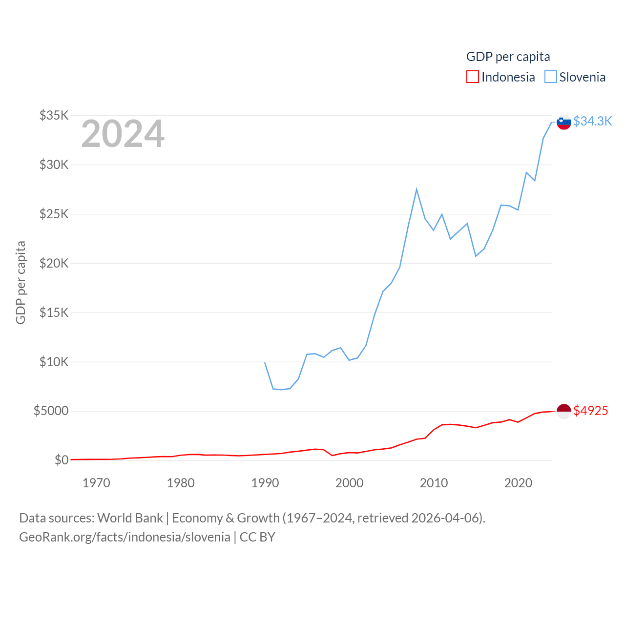 By GDP, Indonesia ranks 16/197 ($1.4T) and Slovenia ranks 86/197 ($73B). By GDP per capita, Indonesia ranks 121/197 ($4,925), while Slovenia ranks 34/197 ($34,301).