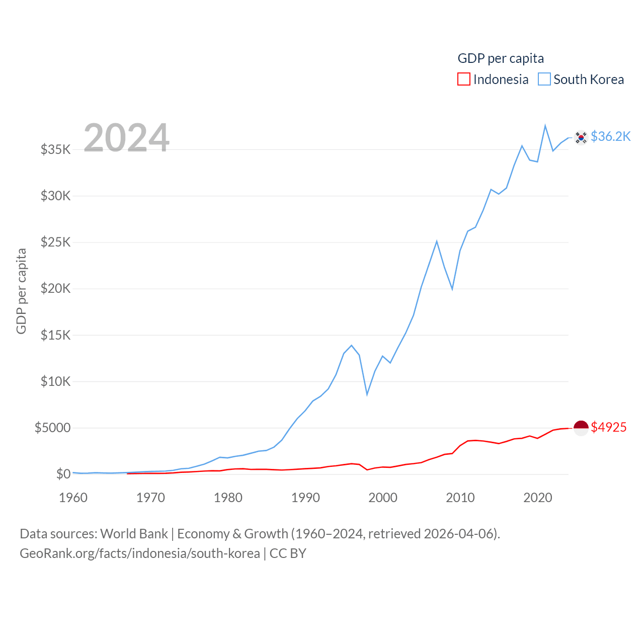 By GDP, Indonesia ranks 16/197 ($1.4T) and South Korea ranks 12/197 ($1.88T). By GDP per capita, Indonesia ranks 121/197 ($4,925), while South Korea ranks 31/197 ($36,239).