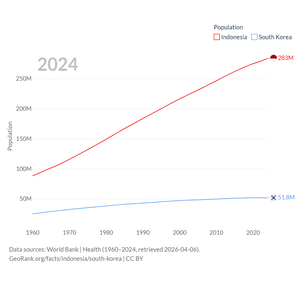 Indonesia has a population of 283M (ranked 4/197), compared with 51.8M in South Korea (ranked 29/197). Indonesia's land area is 730,720 sq mi versus 37,684 sq mi for South Korea (ranked 14th vs. 105th).