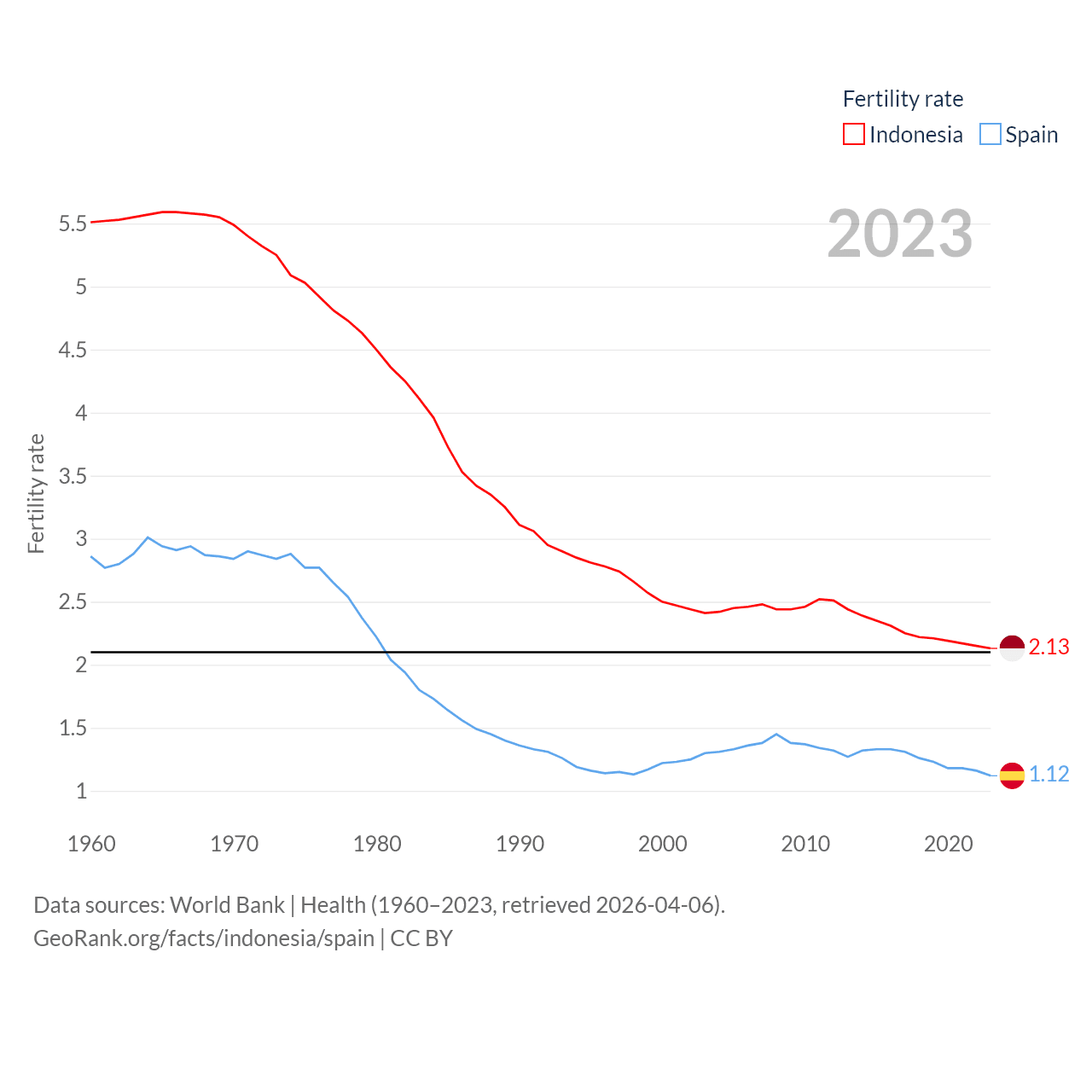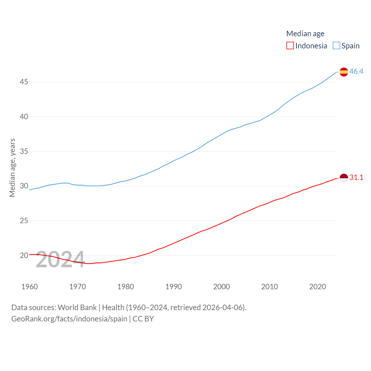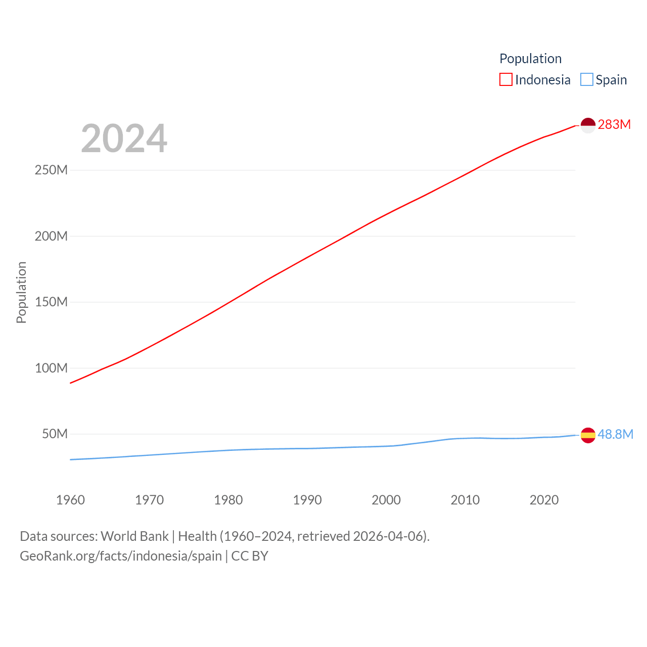 Indonesia has a population of 283M (ranked 4/197), compared with 48.8M in Spain (ranked 32/197). Indonesia's land area is 730,720 sq mi versus 192,934 sq mi for Spain (ranked 14th vs. 51st).