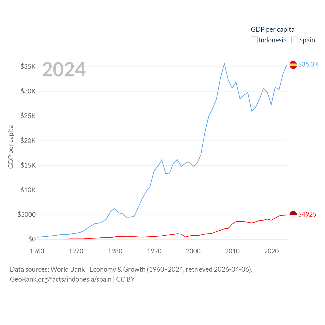 By GDP, Indonesia ranks 16/197 ($1.4T) and Spain ranks 15/197 ($1.73T). By GDP per capita, Indonesia ranks 121/197 ($4,925), while Spain ranks 32/197 ($35,327).