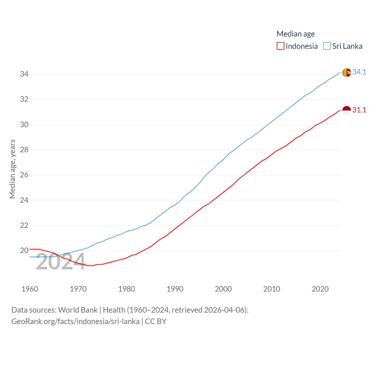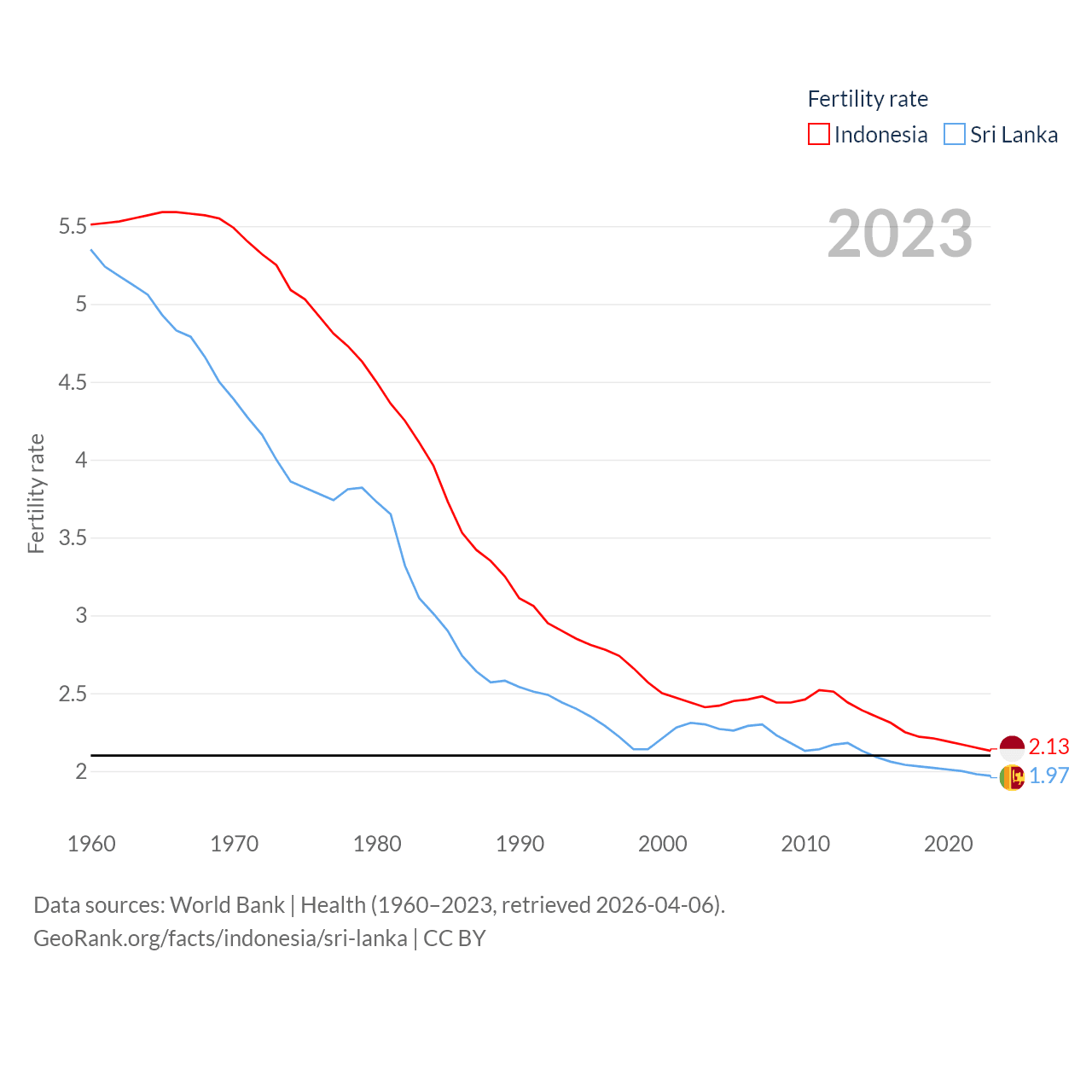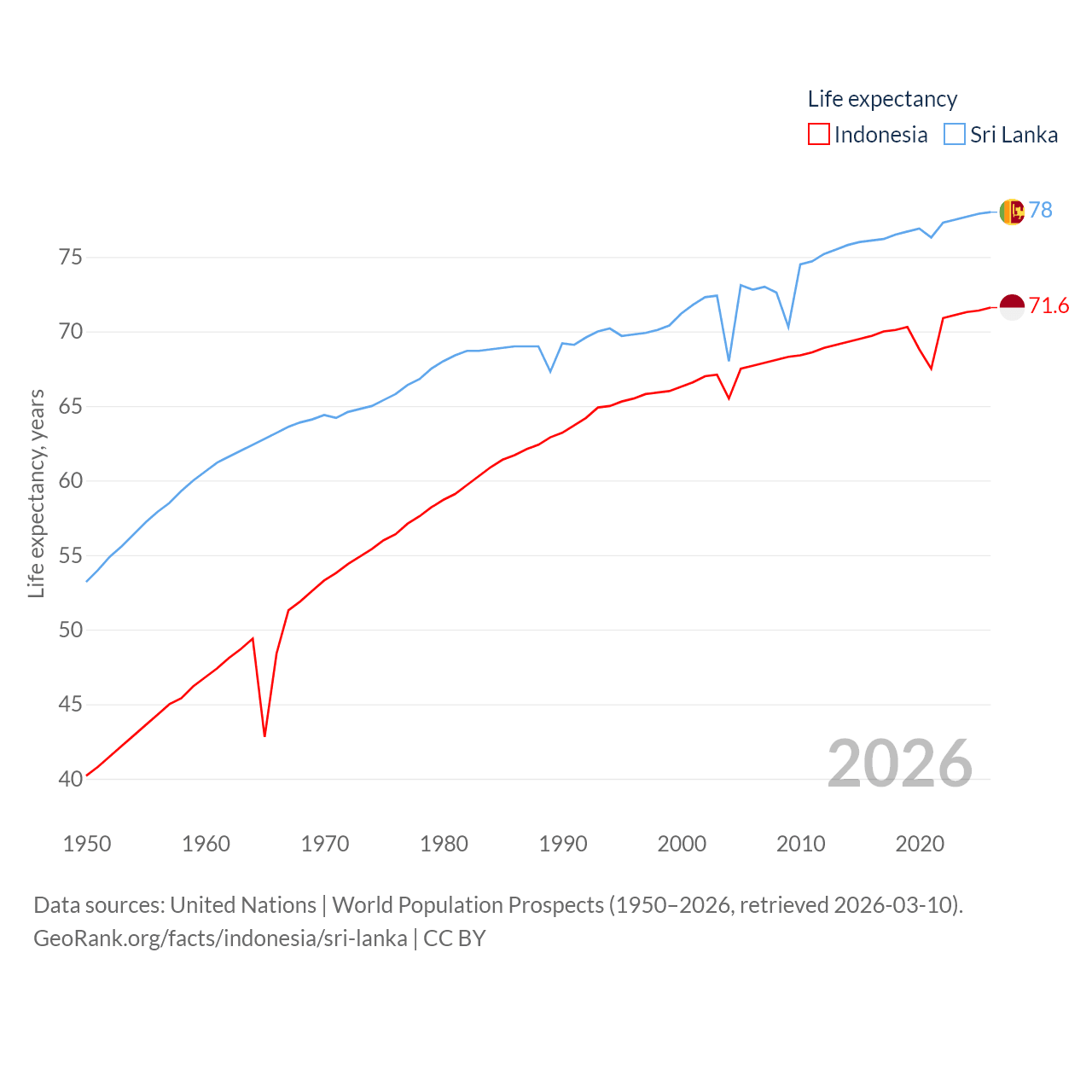 Indonesia has a population of 283M (ranked 4/197), compared with 21.9M in Sri Lanka (ranked 61/197). Indonesia's land area is 730,720 sq mi versus 23,884 sq mi for Sri Lanka (ranked 14th vs. 122nd).