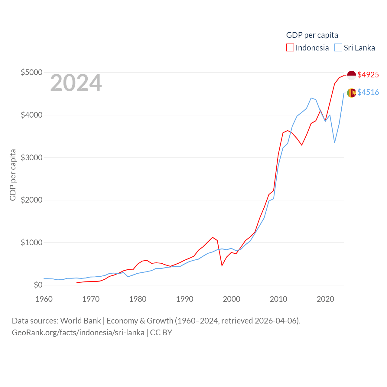 By GDP, Indonesia ranks 16/197 ($1.4T) and Sri Lanka ranks 72/197 ($99B). By GDP per capita, Indonesia ranks 121/197 ($4,925), while Sri Lanka ranks 124/197 ($4,516).