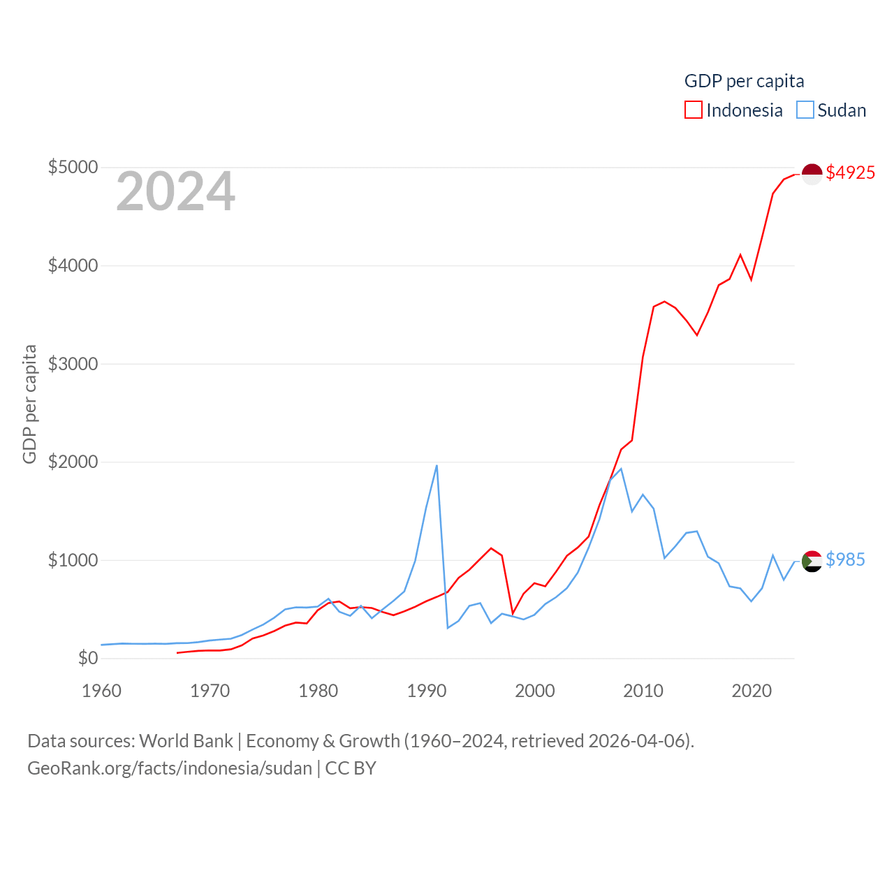 By GDP, Indonesia ranks 16/197 ($1.4T) and Sudan ranks 94/197 ($49.7B). By GDP per capita, Indonesia ranks 121/197 ($4,925), while Sudan ranks 179/197 ($985).